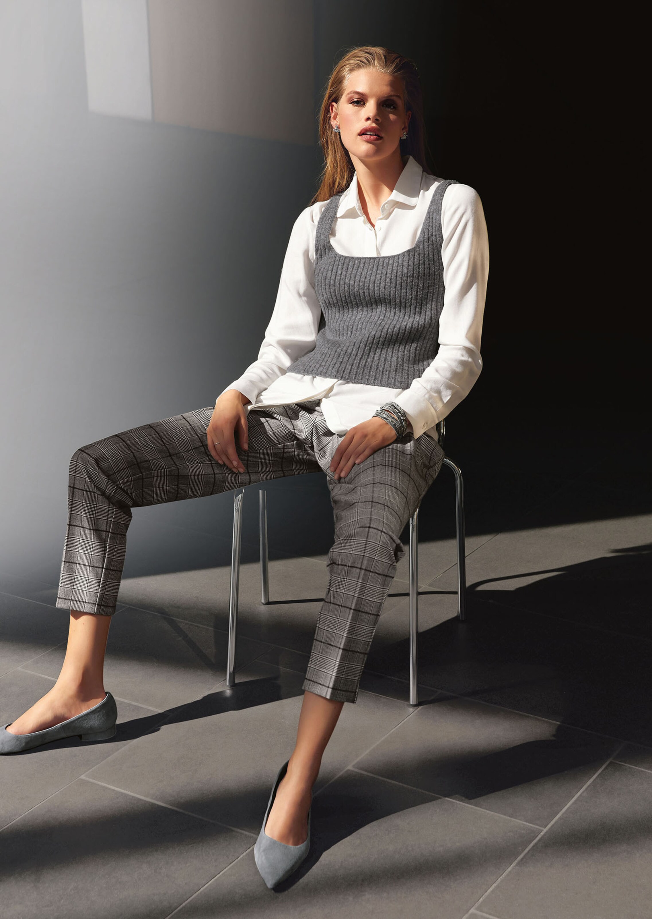 Ärmellos, taillenkurz und in effektvollem Rippstrick – dieses Top verwöhnt nicht nur mit angenehmem Komfort, es bringt auch einen stylischen Twist in raffinierte Lagen-Looks. Denn zu klassischen Blusen oder modischen Shirts werden jetzt kleine Stricktops kombiniert. Ein super lässiger Auftritt! Aufwendig fully fashioned gestrickt zeigt sich das Top mit schmalen Trägern und tiefem Carré-Ausschnitt im Vorderteil. Durch die Naturqualität aus kuschelig weicher Schurwolle ist das Stricktop auch auf blosser Haut ein Genuss.