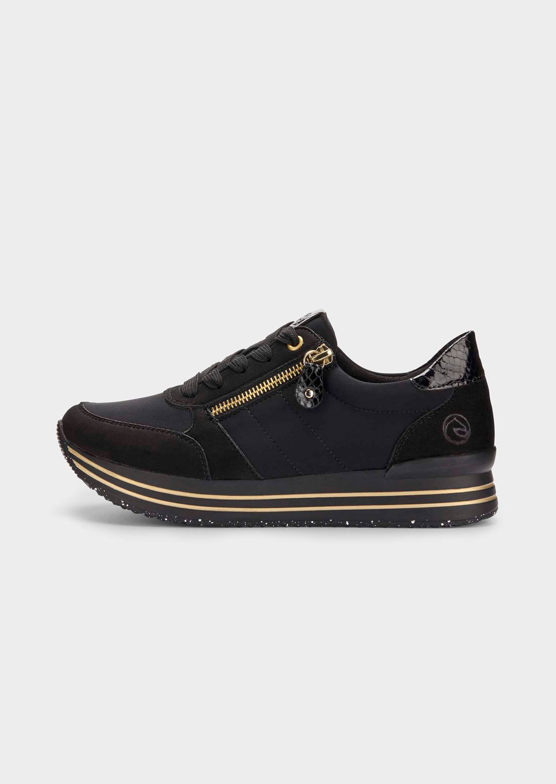Dieser Sneaker von REMONTE ist ein echtes Style-Statement! Der Materialmix aus Textil und Synthetik, goldene Akzente und der seitliche Zipper setzen modische Highlights. Die dezente Plateausohle und die klare Linienführung machen ihn zu einem perfekten Stylingpartner für sportiv interpretierte Business-Looks. Innen sorgt atmungsaktives Microvelours für ein angenehmes Trageklima. Das extra weiche Wechselfussbett bietet maximalen Tragekomfort