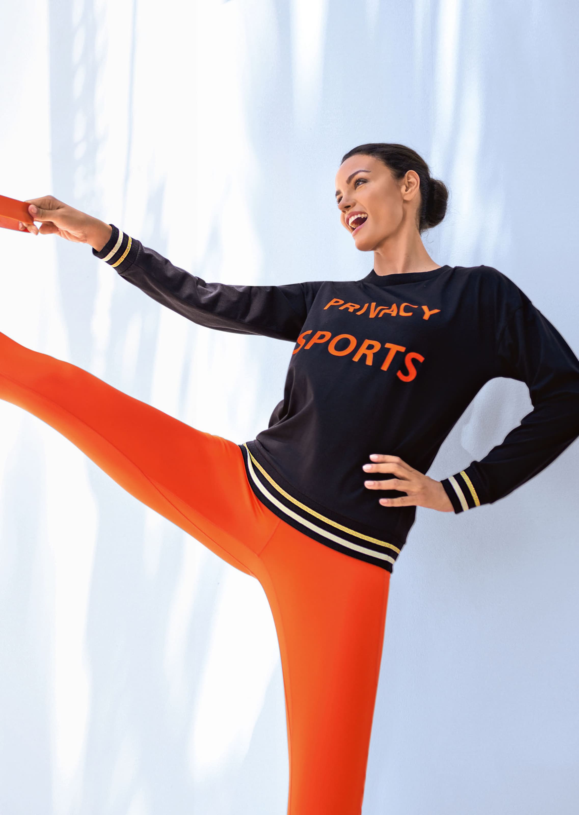 Für Sport, Freizeit oder City – kein anderes Basic ist so vielseitig einsetzbar wie das Sweatshirt. Dieses Modell erhält mit dem PRIVACY SPORTS Logo-Flockprint im Vorderteil ein modisches Upgrade und offenbart so seine Herkunft auf besonders effektvolle Weise. Ein super lässiges Lieblingsstück aus hochwertigem Baumwoll-Stretch – herrlich weich, hautsympathisch und angenehm elastisch wird das Tragen zum puren Vergnügen. Der Rundhals-Ausschnitt ist mit einem unifarbenen Rippenbündchen gestaltet, am langen Ärmel und Saum sorgen gestreifte Rippenbündchen mit einer Extraprise Glitzer für den gelungenen Abschluss.