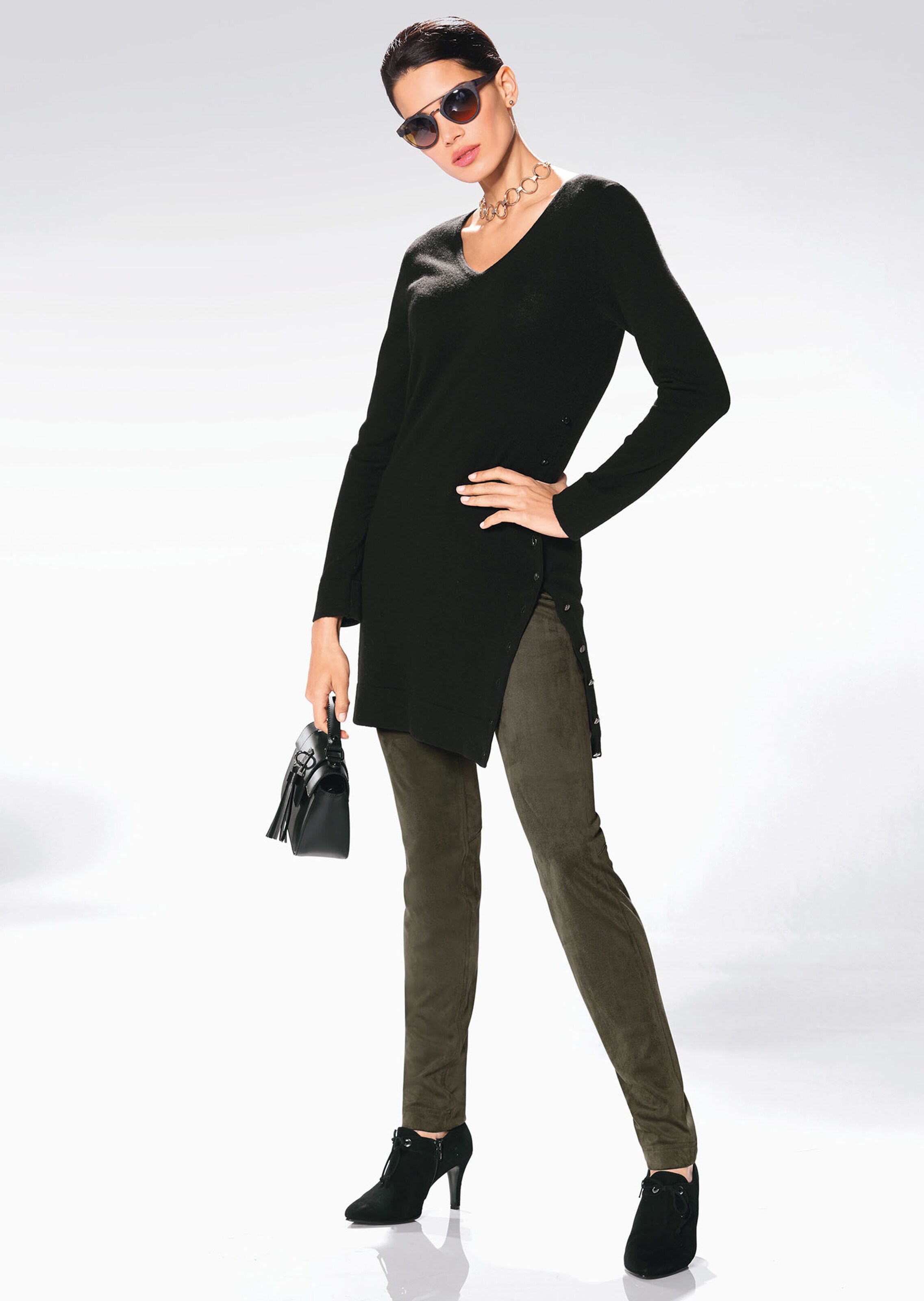 Eine Velourshose, die sich angenehm trägt und mit ihrer weichen Oberfläche begeistert. Gearbeitet aus Microvelours zeigt sie eine moderne Optik. In angesagter Slimline lässt sie sich prima auch zu schlanken, langen Oberteilen kombinieren. Mit elastischem Komfortbund, Gesässtaschen und Gürtelschlaufen bietet sich die schmale Hose auch für ein Styling mit Gürteln an. Im Vorderteil ohne auftragende Taschen kann sie perfekt auch unter schmalen Oberteilen getragen werden. Durch die Schlupfform ist sie besonders bequem.