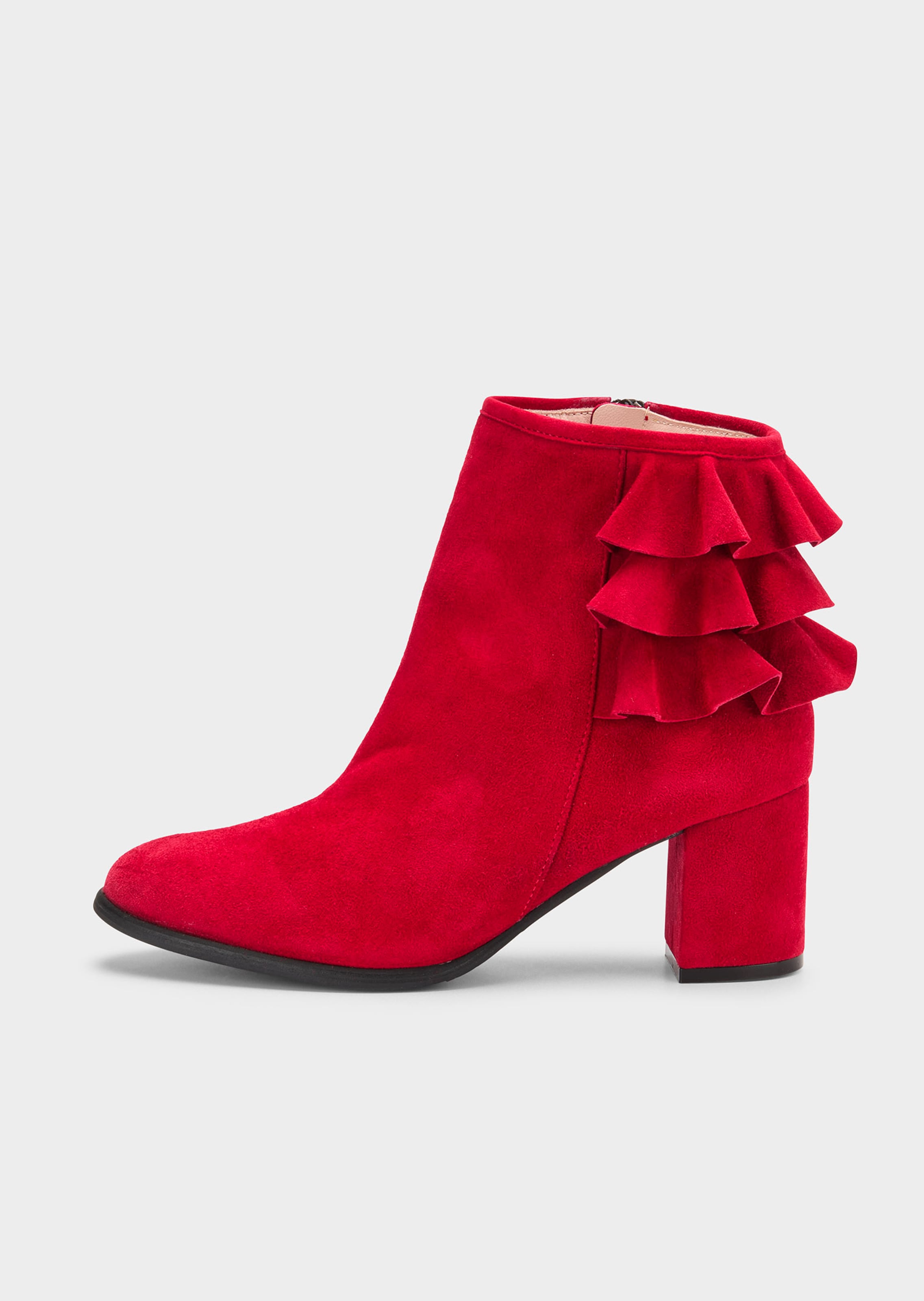 Diese Stiefelette fällt durch Material, Silhouette und ein überraschendes Detail im Fersenbereich auf. Das samtige Wildleder trifft auf dekorative Rüschen, die der klassischen Form eine ausgefallene Note verleihen. Der Blockabsatz sorgt für Höhe, während die Innenausstattung aus Leder viel Komfort bietet. Mit Reissverschluss zu schliessen. Perfekt für alle, die bei Schuhen gern auf aussergewöhnliche Designs setzen und etwas ganz Besonderes suchen.
