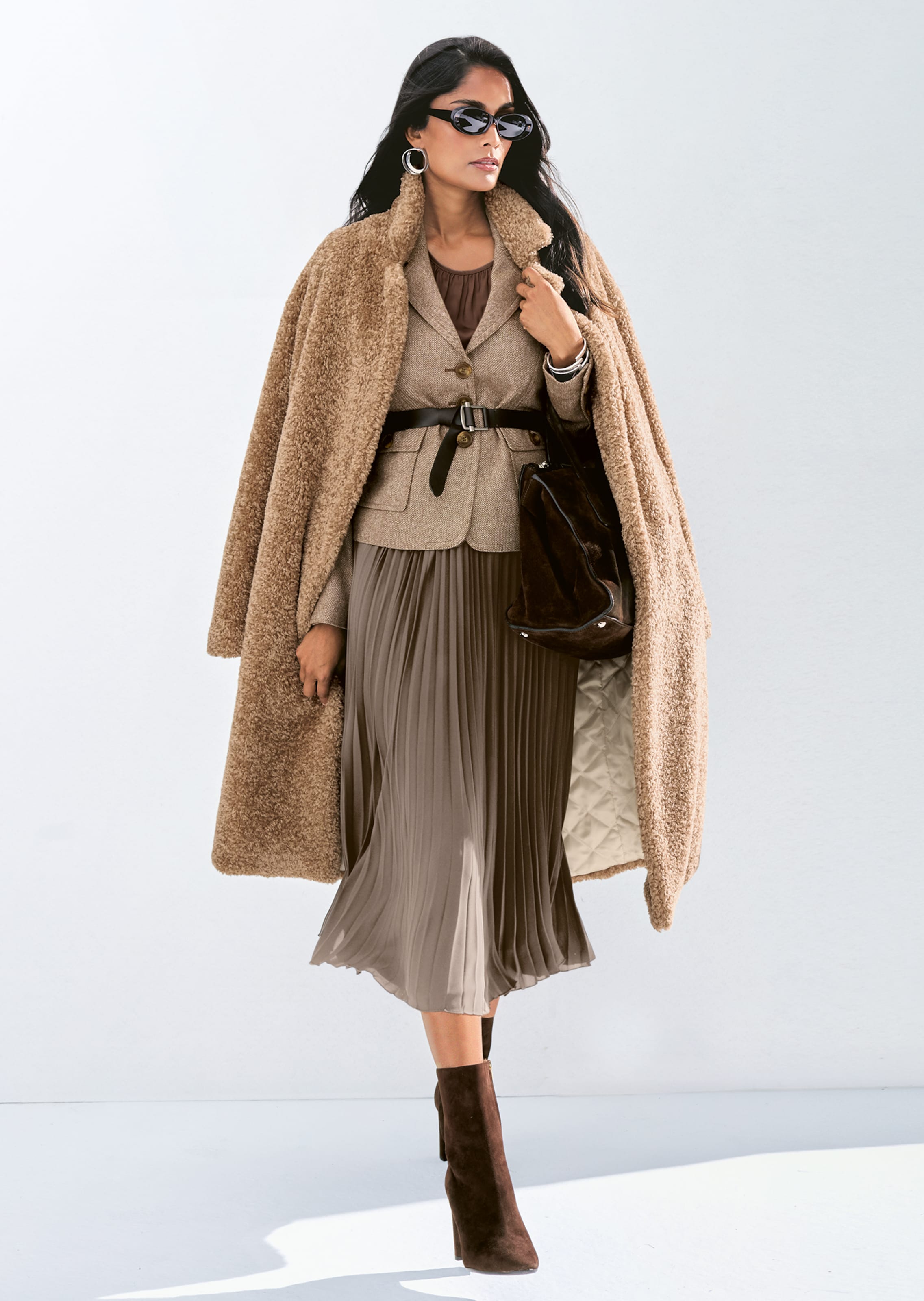 Machen Sie Ihren Style zum Hingucker und fühlen sich dabei rundum wohl! Üppiger Teddy-Plüsch ist aufregend modisch im Look, wunderbar weich im Trage-Gefühl und hält angenehm warm. Ein stylischer Trendsetter für die kalte Jahreszeit, der mit edlem Steppfutter gearbeitet ist und vielseitig kombiniert werden kann. Der legere, langärmelige Zweireiher wird auf verdeckte Druckknöpfe geschlossen und ist mit einem klassischen Reverskragen ausgestattet. Eingearbeitete Aussentaschen und eine innenseitige Tasche schaffen Platz für notwendige Essentials.