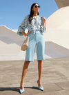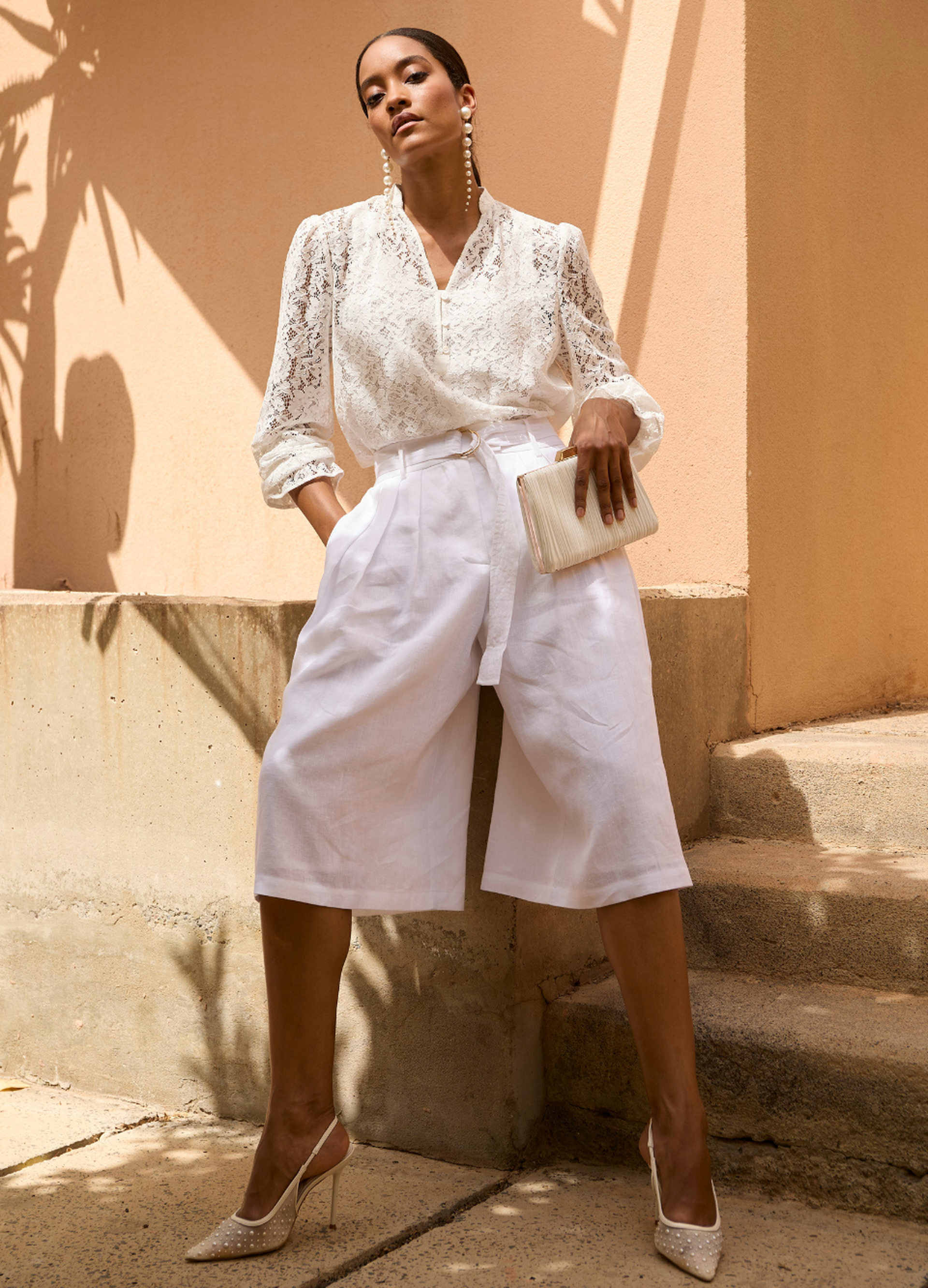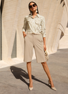 Perfekte Proportionen: Besonders in monochromen Looks wirken Bermudas aus Leinen und anderen leichten Materialien streckend. Plus: Spitze oder offene Schuhe, Modelle in Nude-Tönen sowie Absätze verlängern optisch das Bein und runden das Outfit stilvoll ab.
