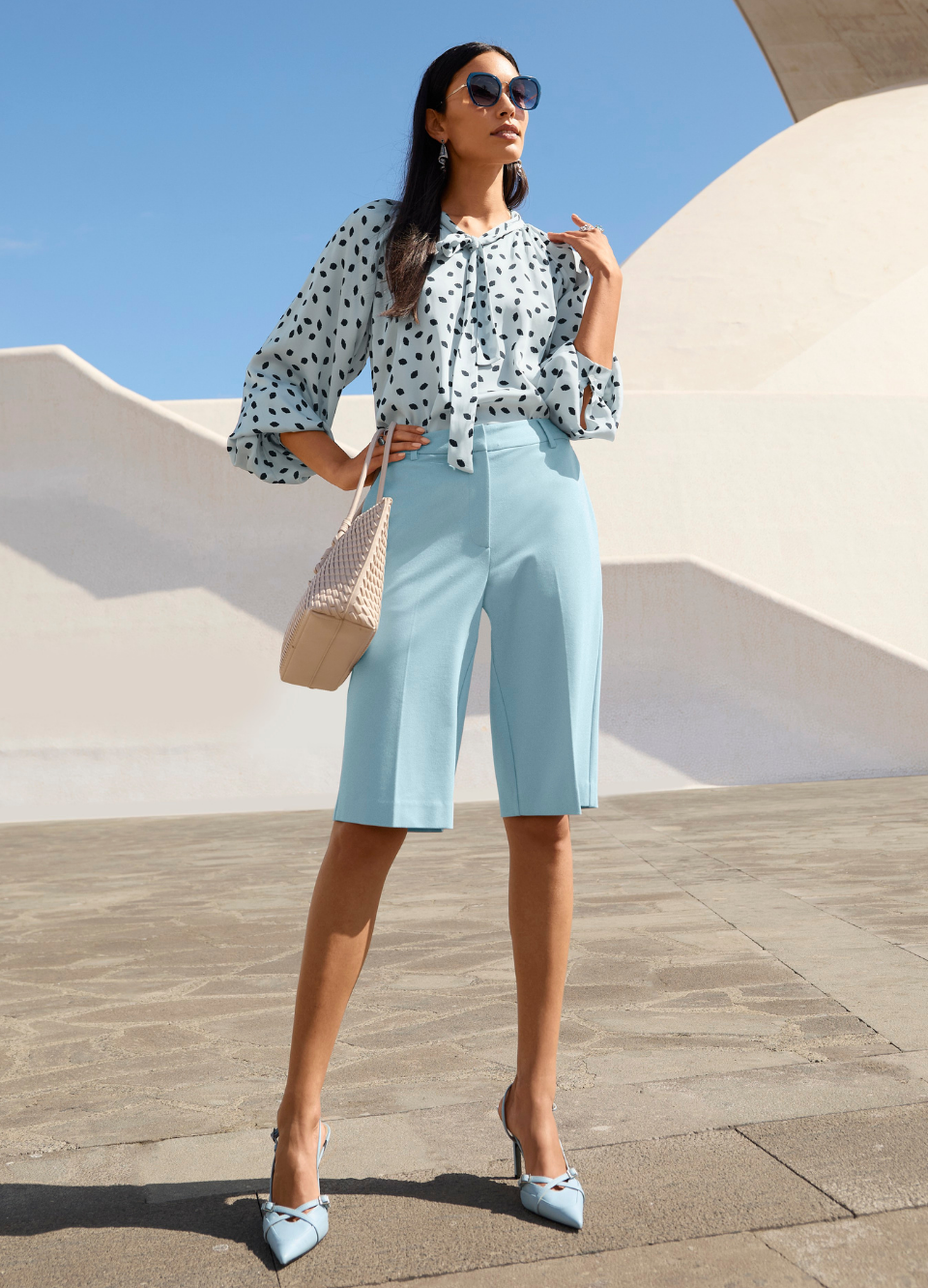 Was Farben angeht, so kommt derzeit niemand an Sorbet-Tönen wie Pfirsich, Mint oder Zitronengelb vorbei. Frische Sommerlaune inklusive! Besonders edel wirken dabei monochrome Outfits: Wählen Sie Bermuda und Oberteil in ähnlichen Tönen und runden Sie den Look mit Accessoires ab. Für den eleganten Touch sorgen Schuhe wie Slingback-Pumps, filigrane Sandaletten oder Ballerinas – je nach Anlass und persönlichem Stil.