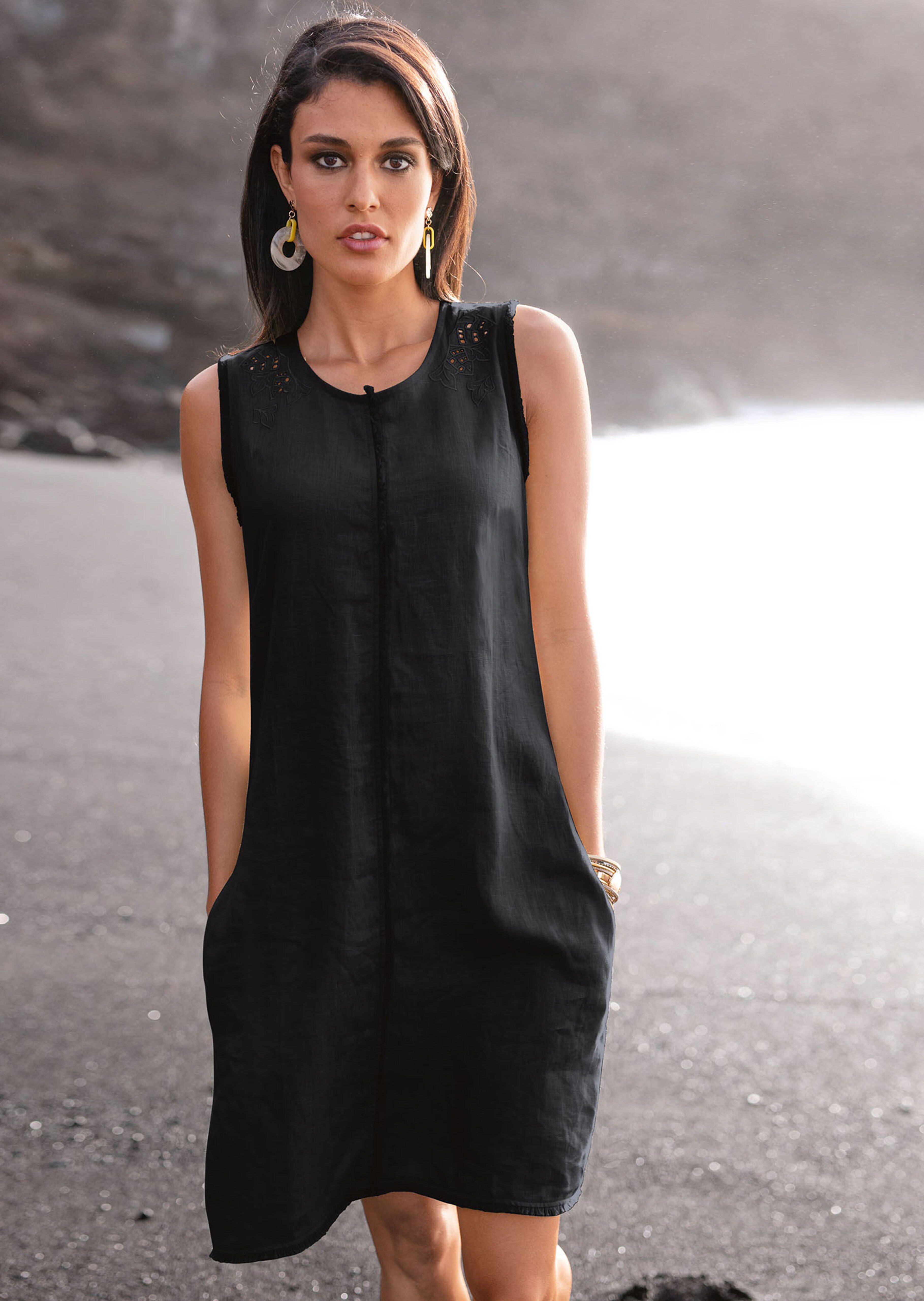 Der Sommer liebt Kleider – jedoch mit einem Schuss Ferienlaune. Feminin im Look und in strahlend frischem Trendton verlockt es zu einem verheißungsvollen Flirt mit der Sonne. Die wertvolle Webware begeistert mit der typischen Struktur naturreinen Leinens und trägt sich gerade bei hohen Temperaturen angenehm kühl. Lässige Fransenverzierungen und die edle Lochstickerei im Vorderteil sind schmückende Extras und lassen das Leinenkleid ausgesprochen modern wirken. Leicht ausgestellt im Schnitt zeigt es sich in ärmelloser Achselform und ist mit Eingrifftaschen und Reißverschluss im Rücken gestaltet.