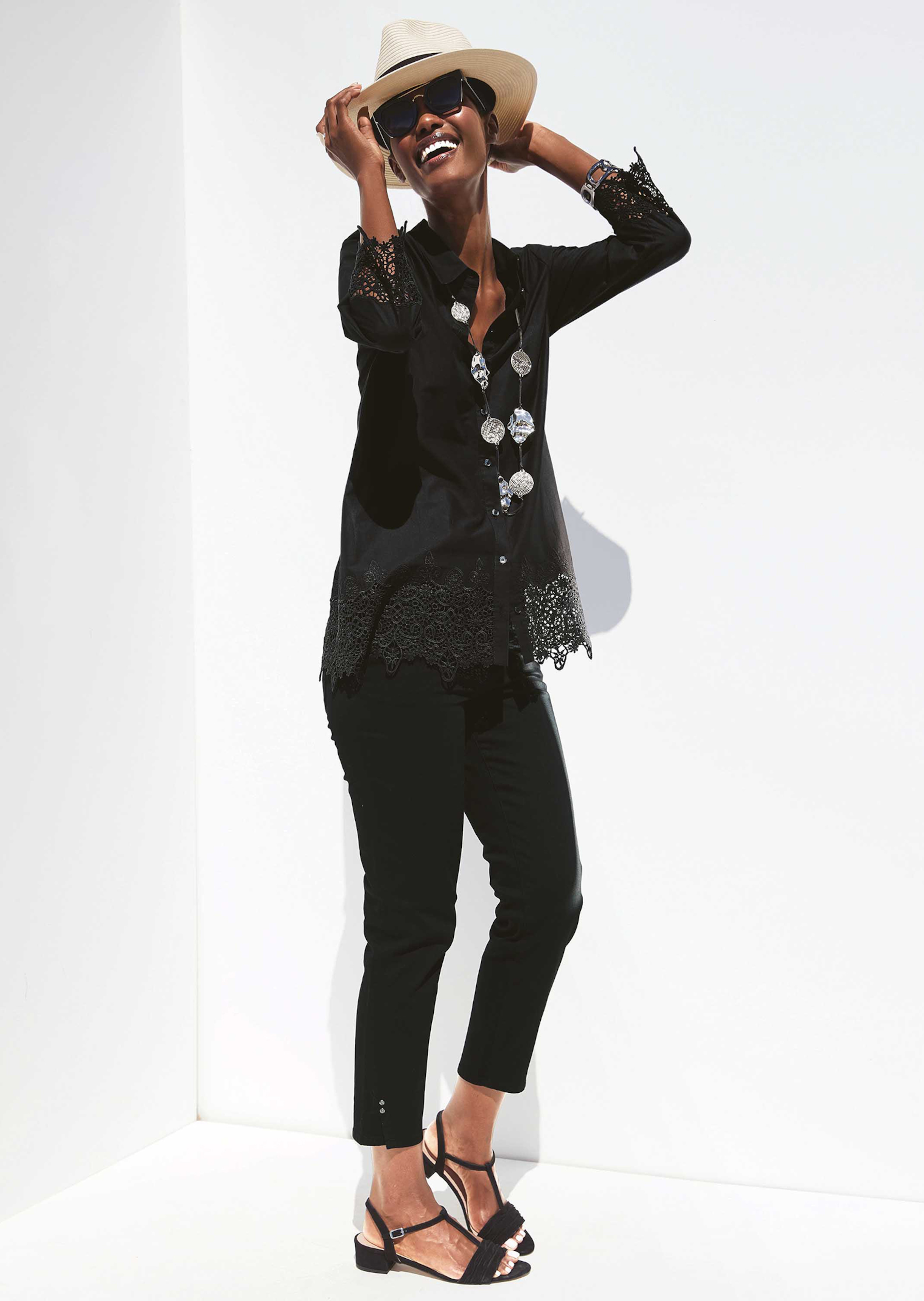 Reizvolle Spitzen-Details verleihen dem Style eine Extraportion Raffinesse und begeistern mit romantisch femininer Note. Eine Bluse aus hautschmeichelnder Baumwoll-Qualität, die edle Akzente setzt und Looks von lässig bis elegant liebevoll abrundet. Angenehm kühl auf der Haut präsentiert sich der Style in leicht taillierter Linie mit Hemdkragen und durchgehender Knopfleiste. Die attraktiven 3/4-Ärmel schließen wie der Saum mit einer Bordüre aus edler 3D-Spitze und wertvoller Bogenkante ab. Sie machen das Lieblingsstück zum absoluten Hingucker und versprechen unvergessliche Auftritte.