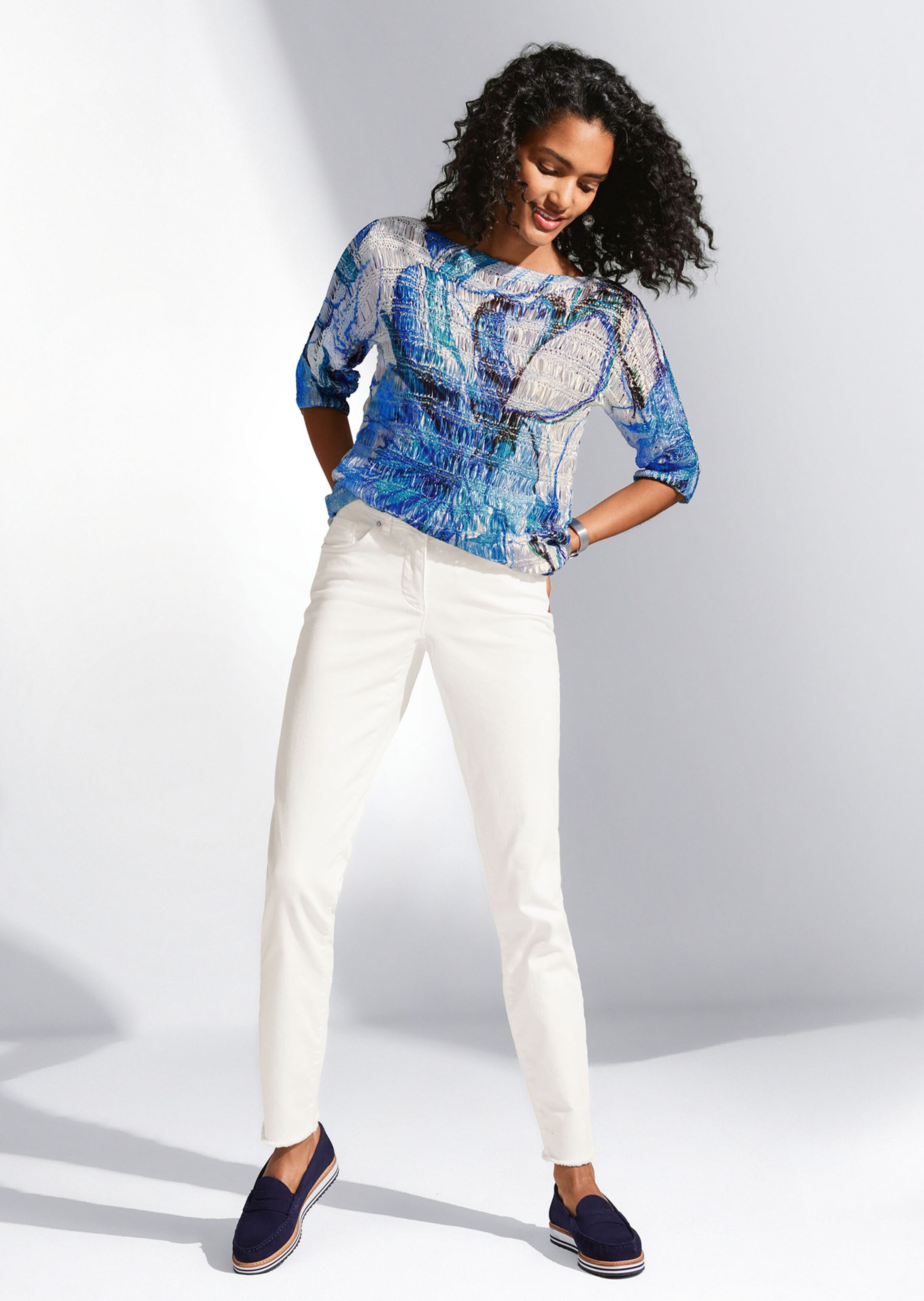 Ein Kunstwerk zum Tragen! Der bedruckte Bändchenpullover begeistert mit seiner kunstvollen Machart: Das effektvolle Bändchengarn wurde hier großmaschig verstrickt und aufwendig mit prachtvollem Blütenprint versehen – für einen fantastischen Effekt. Der figurumspielende, lässige Style ist mit U-Boot-Ausschnitt, Kurzarm und gerippten Ärmelbündchen gestaltet. Kombinieren Sie ihn zu tonigen Partnern für einen frischen, ausdrucksstarken Sommerlook. Tipp: Waschen Sie ihn im Wäschesack!