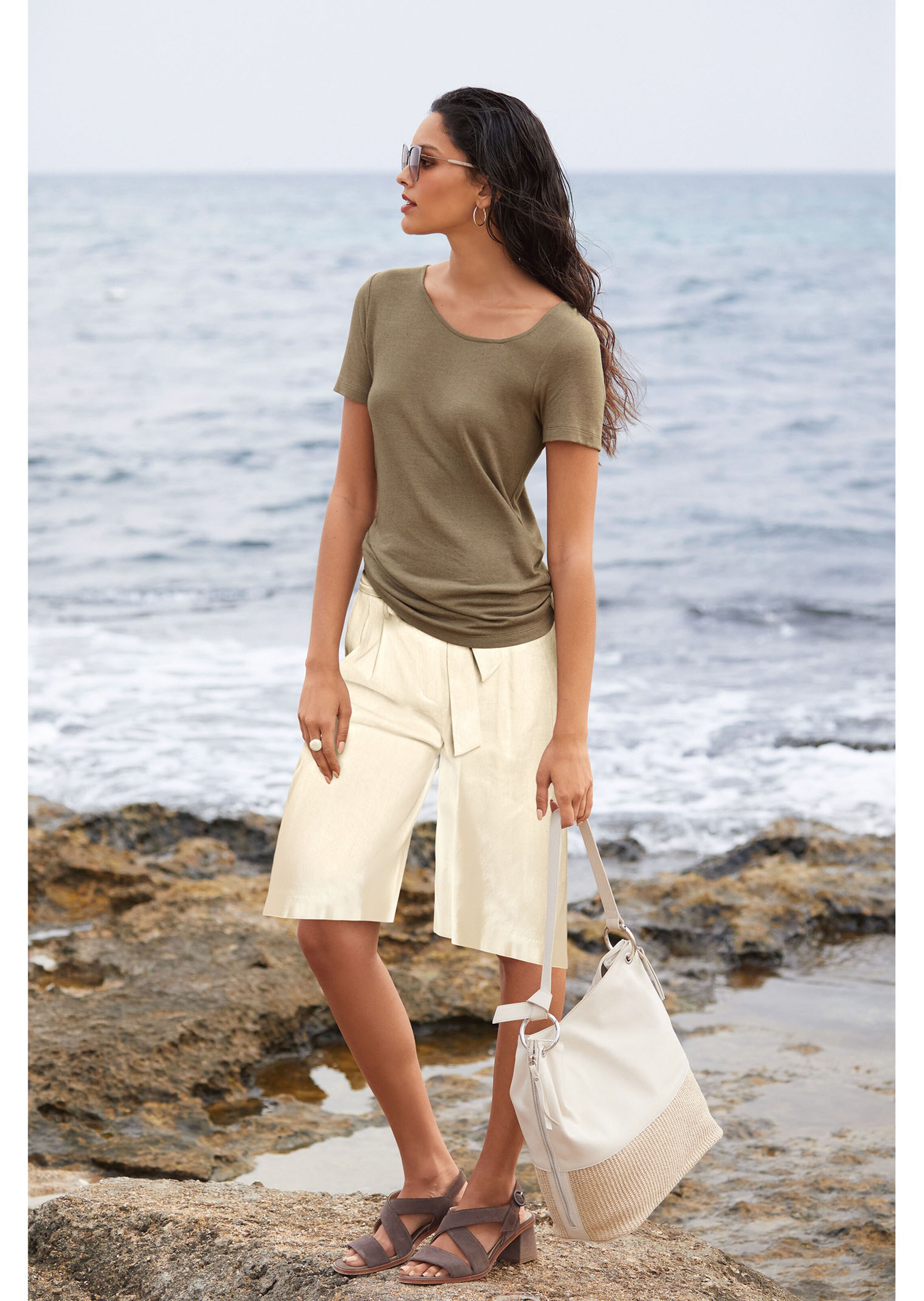Eine lässige Allrounderin für elegante und legere Stylings. Die Bermuda mit weitem Bein können Sie auch für gehobenere Anlässe zu edlen Oberteilen kombinieren. Ihr sommerlicher Leinen-Viskose-Mix trägt sich angenehm kühl an warmen Tagen. Wir haben die kurze Hose für einen modernen Look in lässiger Highwaistform und kniefreier Länge mit weitem Bein, angeschnittenem Bund, Bundfalten und Nahttaschen gestaltet. Gürtelschlaufen, ein abnehmbarer Bindegürtel, eine Innenbundsicherung und ein tongier M-Logoknopf sind weitere Details. Dieser Artikel ist nach Standard 100 by OEKO-TEX® zertifiziert und als gesundheitlich unbedenklich beurteilt.