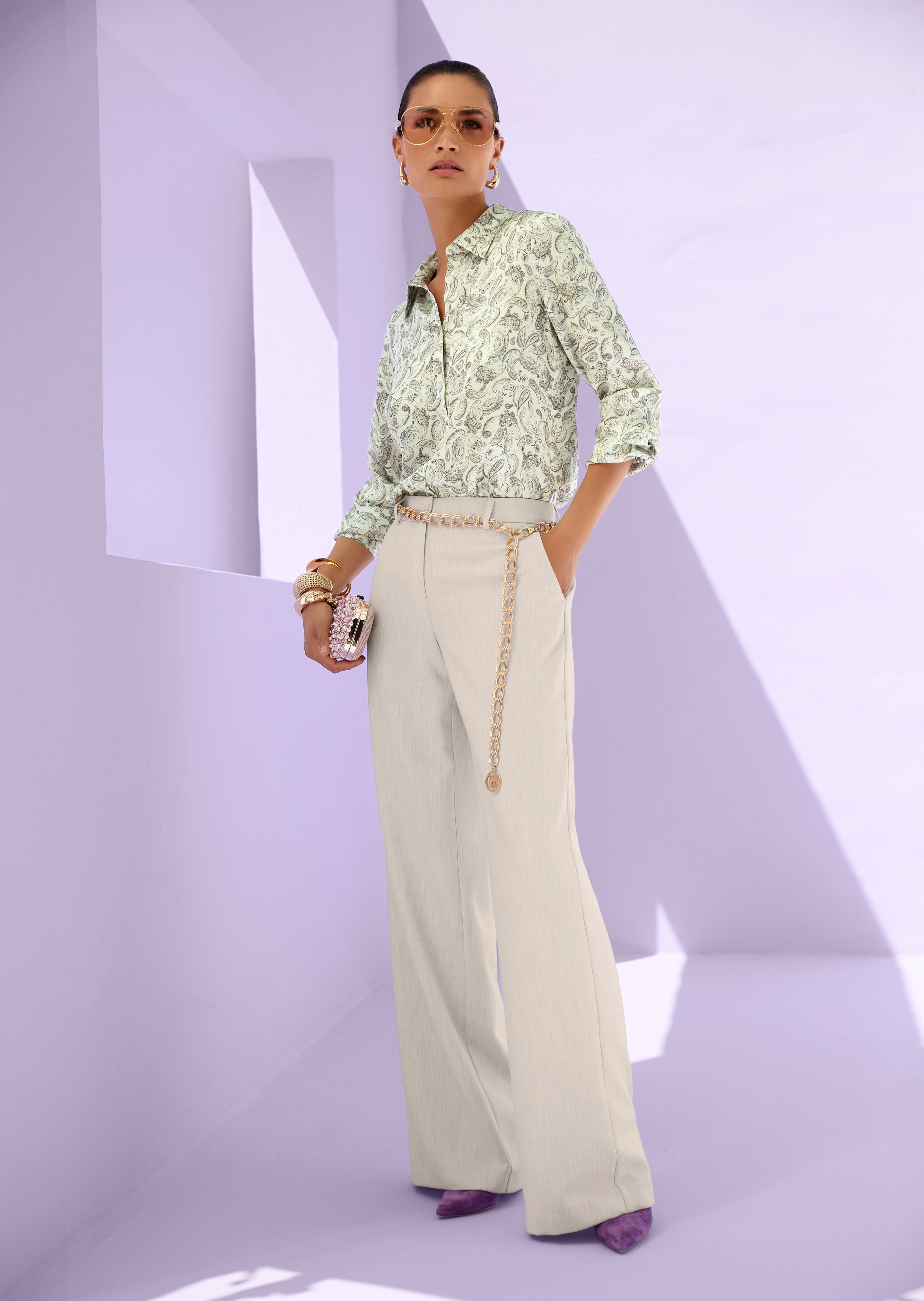 Es ist die Zeit der Muster und Strukturen. Sie bringen Charakter in den Auftritt und begeistern mit kreativen und individuellen Designs. Die weich fließende Viskose-Qualität der Bluse umschmeichelt verführerisch die Haut und sorgt für puren Trage-Genuss. Eine lässig moderne Silhouette, die sich rundum in filigranem Paisley-Print präsentiert und entspannte Looks ebenso ergänzt, wie gepflegte Kombinationen. Hemdkragen, durchgehende Knopfleiste und lange Manschettenärmel mit Schlitz und in Falten gelegt sind klassische Details und daher gesetzt. Die leicht gerundete Saumkante eignet sich hervorragend zum darüber tragen.