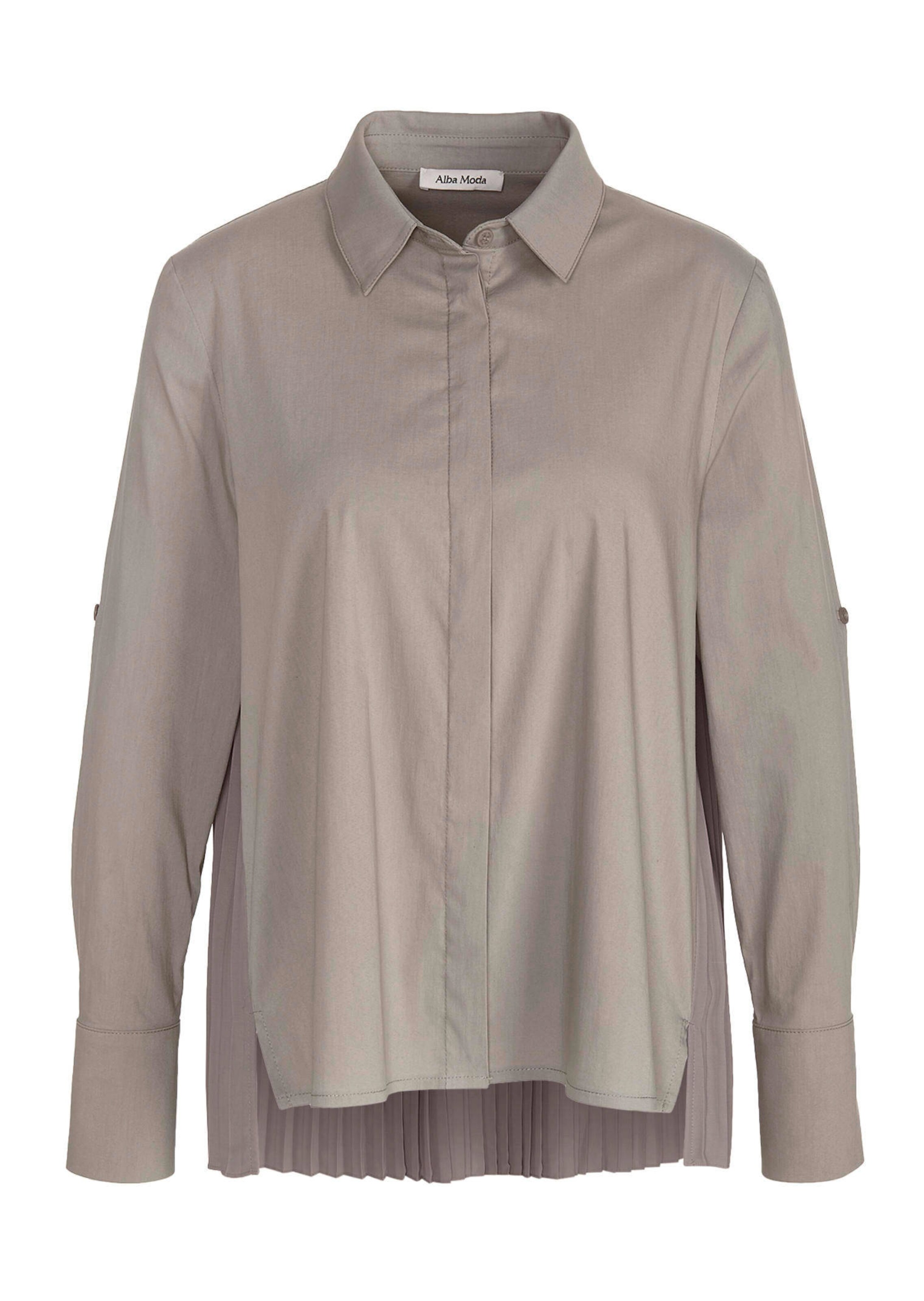 Bluse im Materialmix: Die Baumwoll-Popelin-Ware wird ergänzt von einem Plisseeeinsatz im Rückteil. Verdeckte Knopfleiste, Seitenschlitze und breite Manschetten mit Krempel-Option. Länge in Gr. 38 ca. 66 cm.