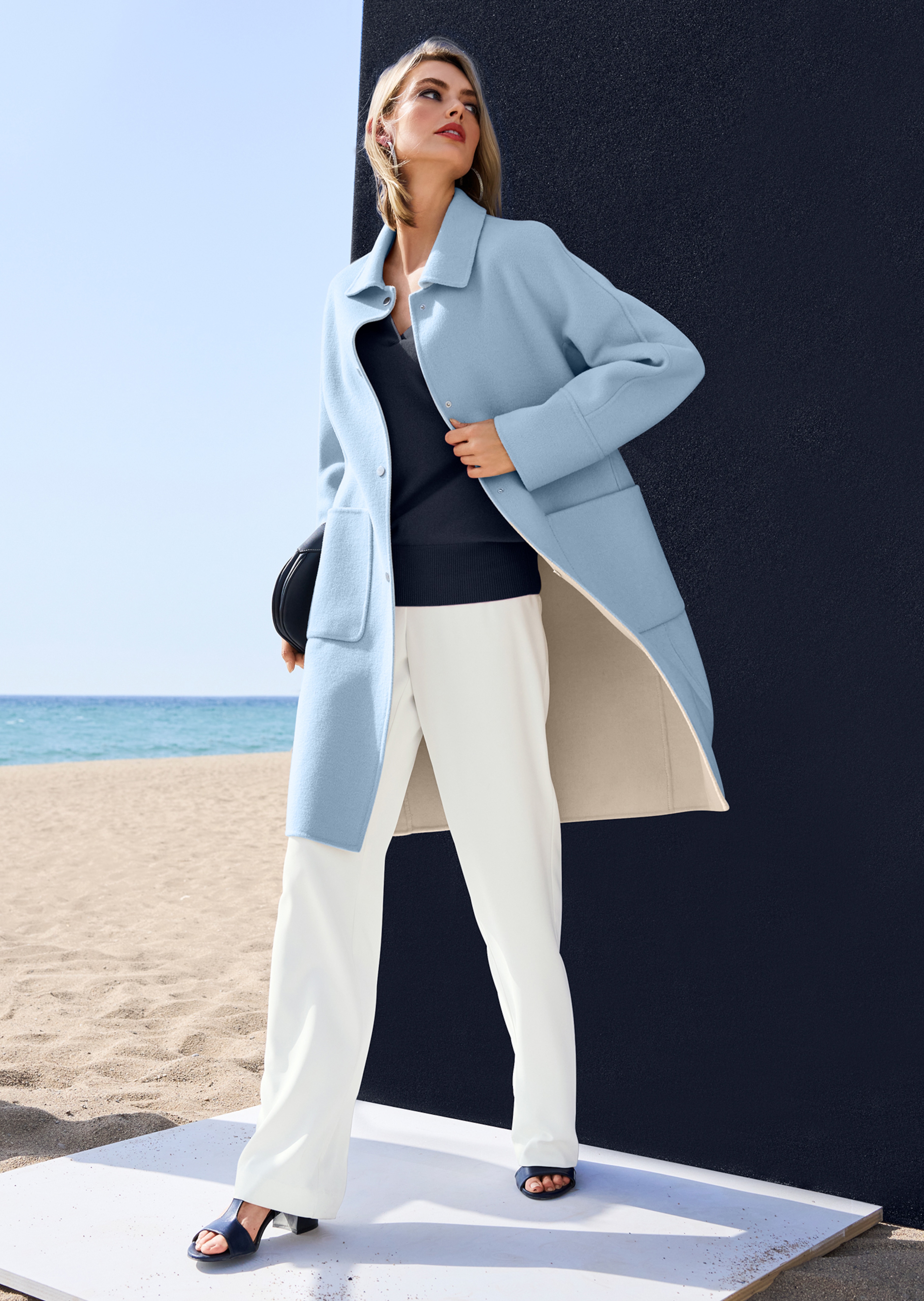 Wertvoller Doubleface macht diesen Mantel zu etwas ganz besonderem und rundet Ihren Look mit edlem Chic ab. Der weiche Garnmix wurde doppellagig gearbeitet und präsentiert Innen- und Außenseite in wertvollem Kontrast. Die legere Silhouette wird von Kimono-Ärmeln in raffinierter Manschetten-Optik akzentuiert und ist auf Druckknöpfe zu schließen. Ein stilvoller Klappkragen und aufgesetzte Taschen runden den Look perfekt ab. Der edle Styling-Partner benötigt kein Futter und ist daher leicht und angenehm zu tragen.