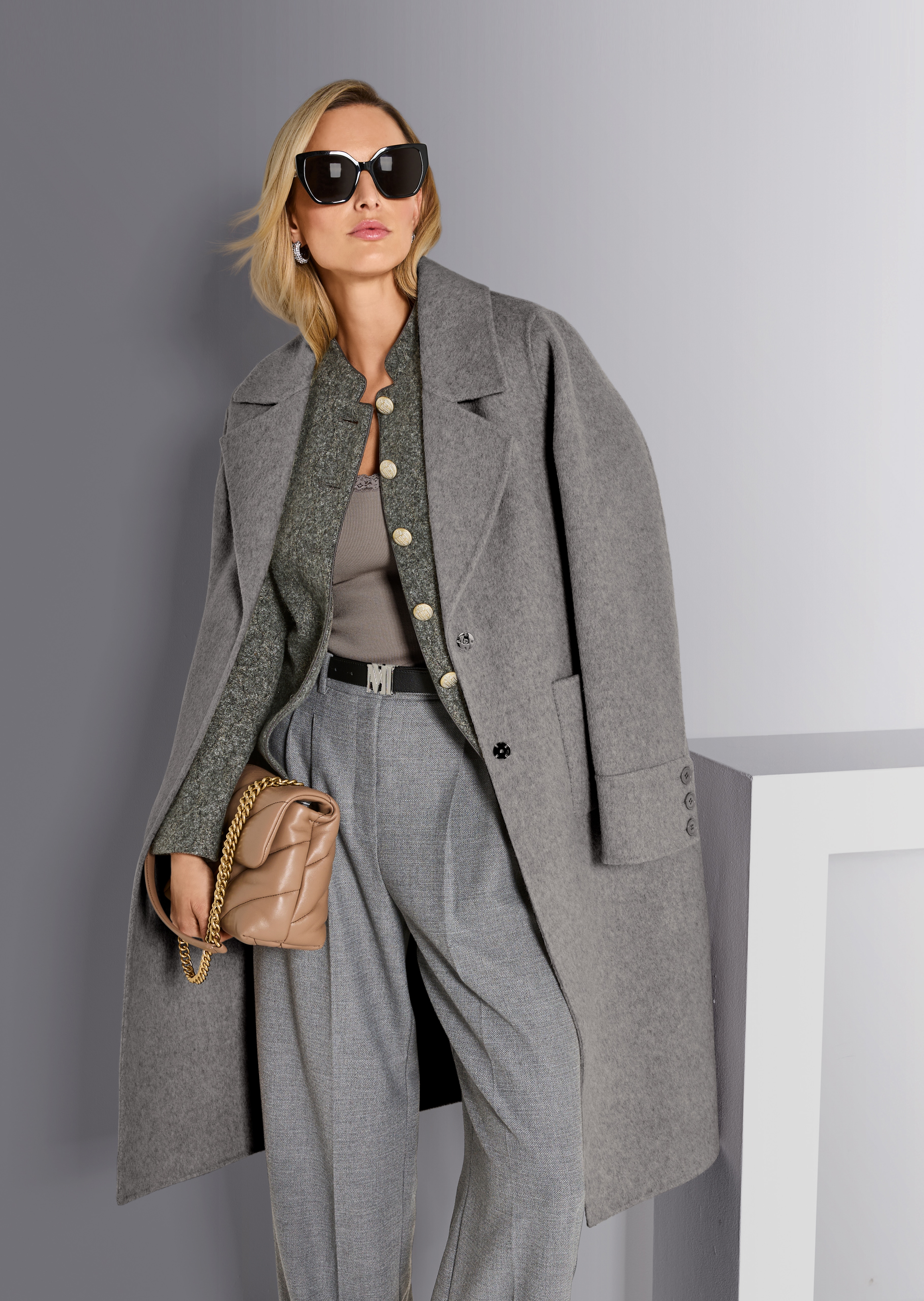 Wenn Sie für Ihren Look ein lässig modernes Finish suchen, liegen Sie hier genau richtig! Die hochwertige Wollmischung dieses Mantels präsentiert sich in wertvoller, zweilagiger Doubleface-Verarbeitung und ist durch den Kamelhaar-Anteil besonders weich im Griff. Der legere Einreiher ist per Druckknopf zu schließen und mit weit ausladendem Kragen, aufgesetzten Taschen, langen Manschettenärmeln und seitlichen Saumschlitzen gearbeitet. Ein edler Look, der vielseitig kombiniert werden kann.