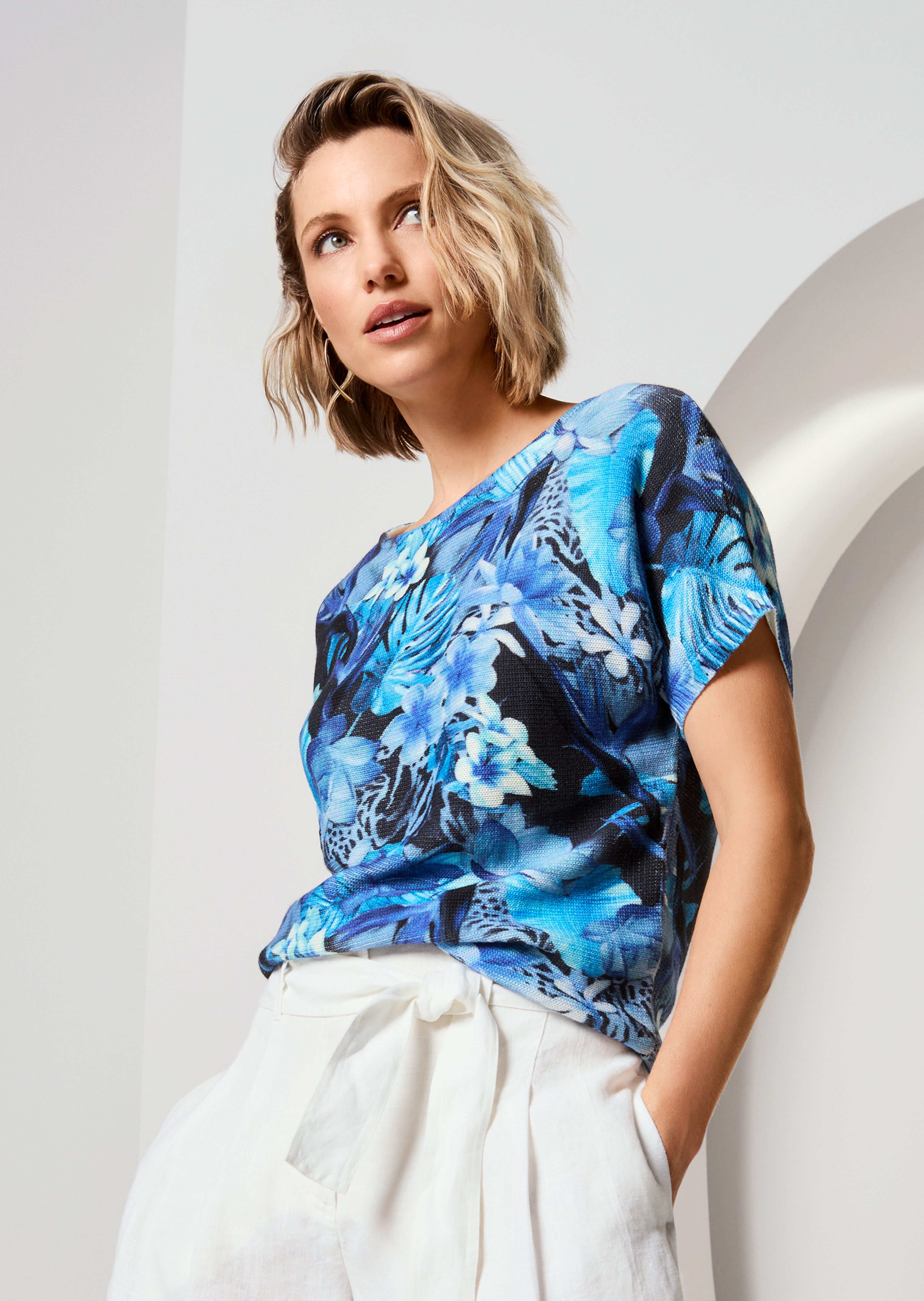 Ein Maschen-Style, der trendstarke Signale sendet und auch im Sommer angenehm zu tragen ist. Die natürliche Garnmischung aus Ramie und Baumwolle ist kühl auf der Haut und zeigt sich in einem farbstarken Print aus Floral- und Animal-Motiven. Das individuell variierende Muster-Mix macht jeden Pullover zum Unikat. U-Boot-Ausschnitt und überschnittene Schultern runden den Look ab.