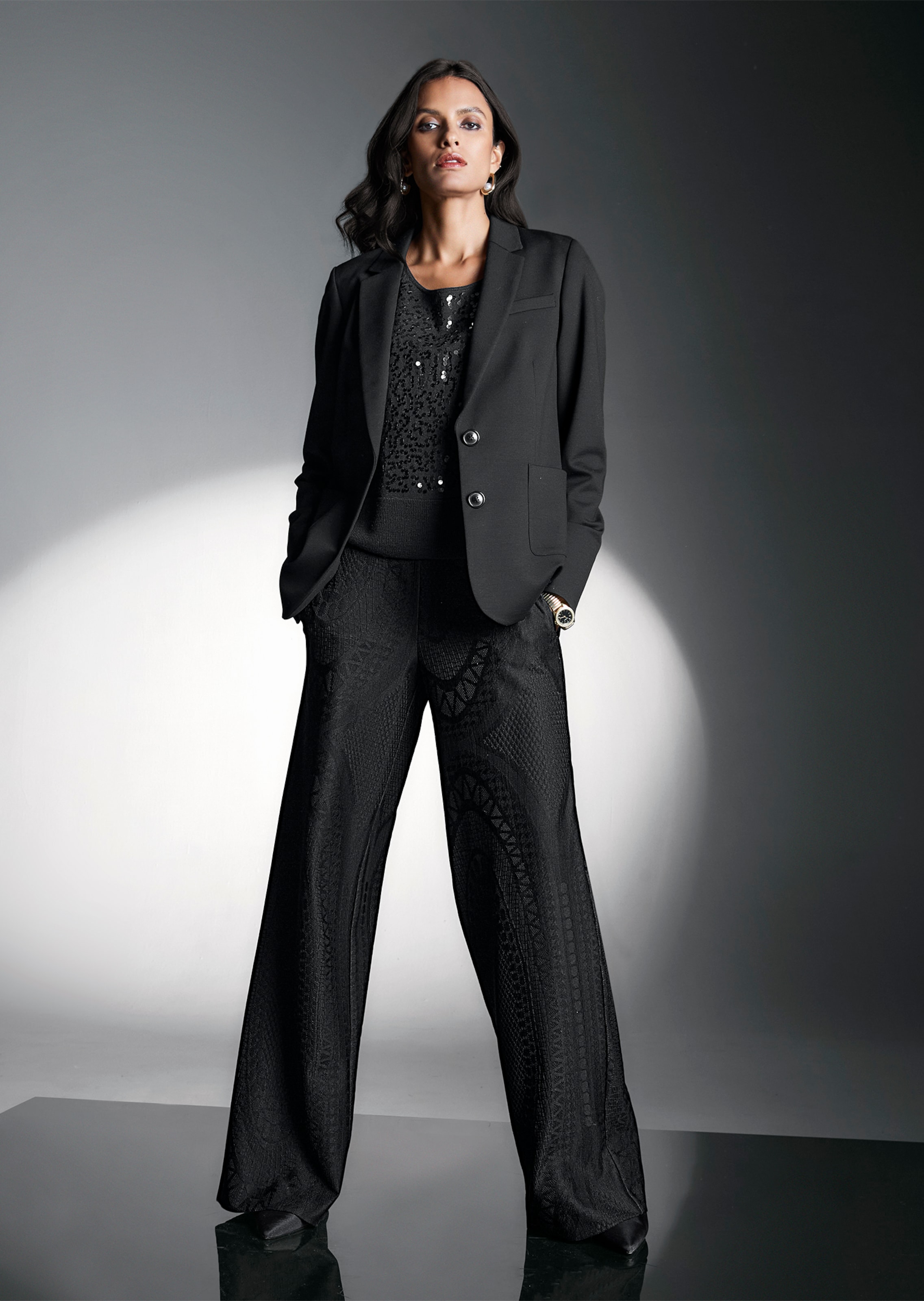 Unsere Hose mit lässig eleganter, weiter Beinform besticht durch ein dezentes Ton-in-Ton-Muster und ist die perfekte Wahl für besondere Anlässe und Abendveranstaltungen. Die hochwertige Stretch-Qualität und der breite, elastische Formbund bieten ein angenehmes Tragegefühl und erleichtern das An- und Ausziehen. Seitlich eingearbeitete Taschen ergänzen die Hose nicht nur funktional, sondern verleihen ihr auch zusätzlichen Charme. Ob kombiniert mit einem Paillettentop oder einem Kaschmirpullover, diese elegante Hose ist ein vielseitiges Essential, das Ihren Kleiderschrank bereichert.