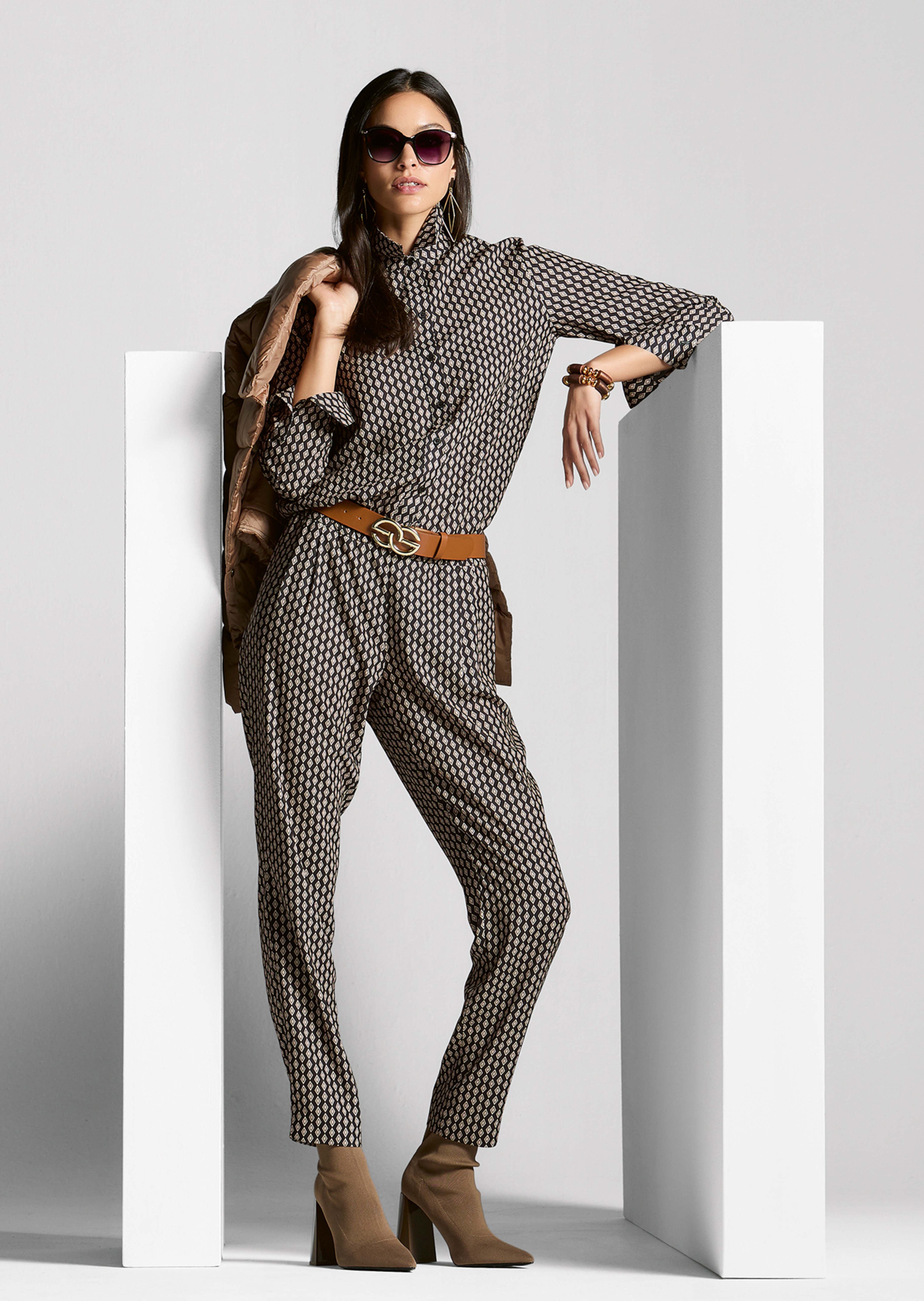 Eine stilvolle Hemdbluse, die durch ihren schlichten Klappkragen und eine durchgehende Knopfleiste mit klassisch legerem Look begeistert. Die langen Ärmel mit Knopfmanschetten und die leicht gerundete Saumlinie verleihen dem Outfit eine zeitlose Eleganz. Der markante grafische Print sorgt für ein modernes und ausdrucksstarkes Erscheinungsbild, das sowohl im Büro als auch in der Freizeit überzeugt. Ein vielseitiges Must-Have, das jedem Kleiderschrank eine besondere Note verleiht.