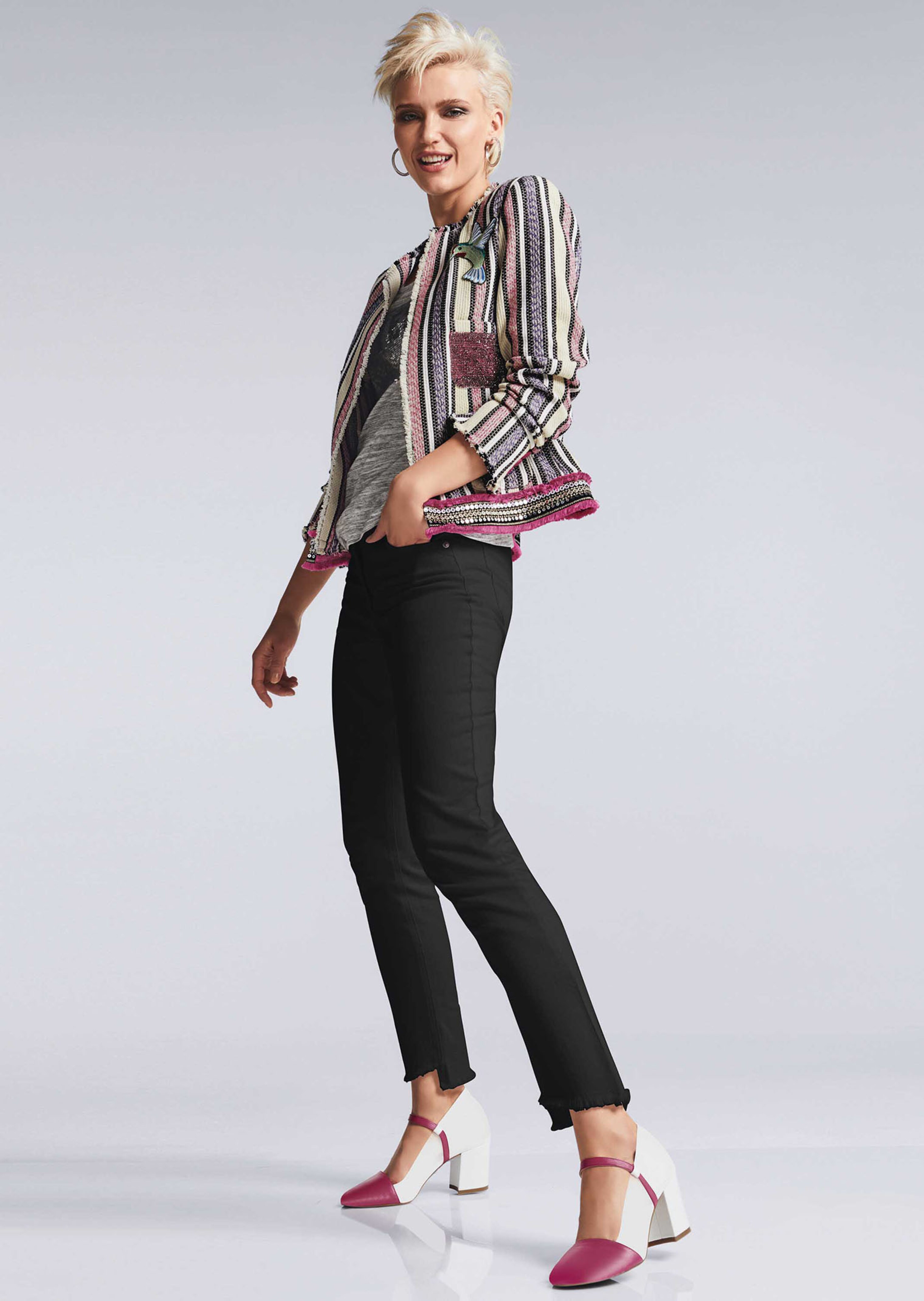 Eine enge Jeans mit frechen Akzenten. In schmaler 5-Pocket-Form zeichnet sie eine schlanke Linie. Ein leichter Used-Effekt verleiht ihr den lässigen Look. Der gefranste Saumabschluss ist vorne kurz und hinten lang – so erhält er einen neuen, witzigen Akzent. Der Formbund mit Gürtelschlaufen bietet sich für durchgezogene Gürtel an. Ein Madeleine-Jeans-Knopf, die Logo-Nieten und das Madeleine-Jeans-Label am Bund erzählen stilvoll von der Herkunft. Zwei Größenläufe werden auch den Anforderungen kleinerer Frauen gerecht.