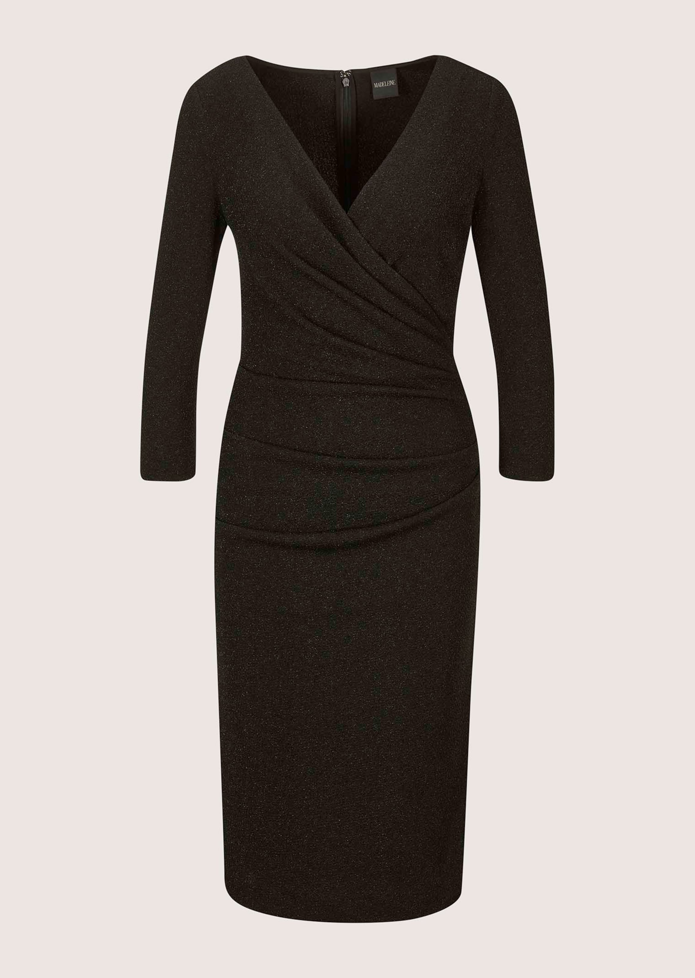 Dieses Kleid überzeugt mit seiner Wickeloptik und einer sanften Drapierung, die die Figur schmeichelnd in Szene setzt. Der V-Ausschnitt verlängert optisch das Dekolleté, während der 3/4-Arm den Arm angenehm bedeckt. Die knieumspielende Länge macht das Etuikleid vielseitig tragbar. Durch das leicht schimmernde Material ist es ideal für festliche Anlässe wie Abendveranstaltungen oder Familienfeiern. Der Reißverschluss im Rücken sorgt für bequemes An- und Ausziehen.