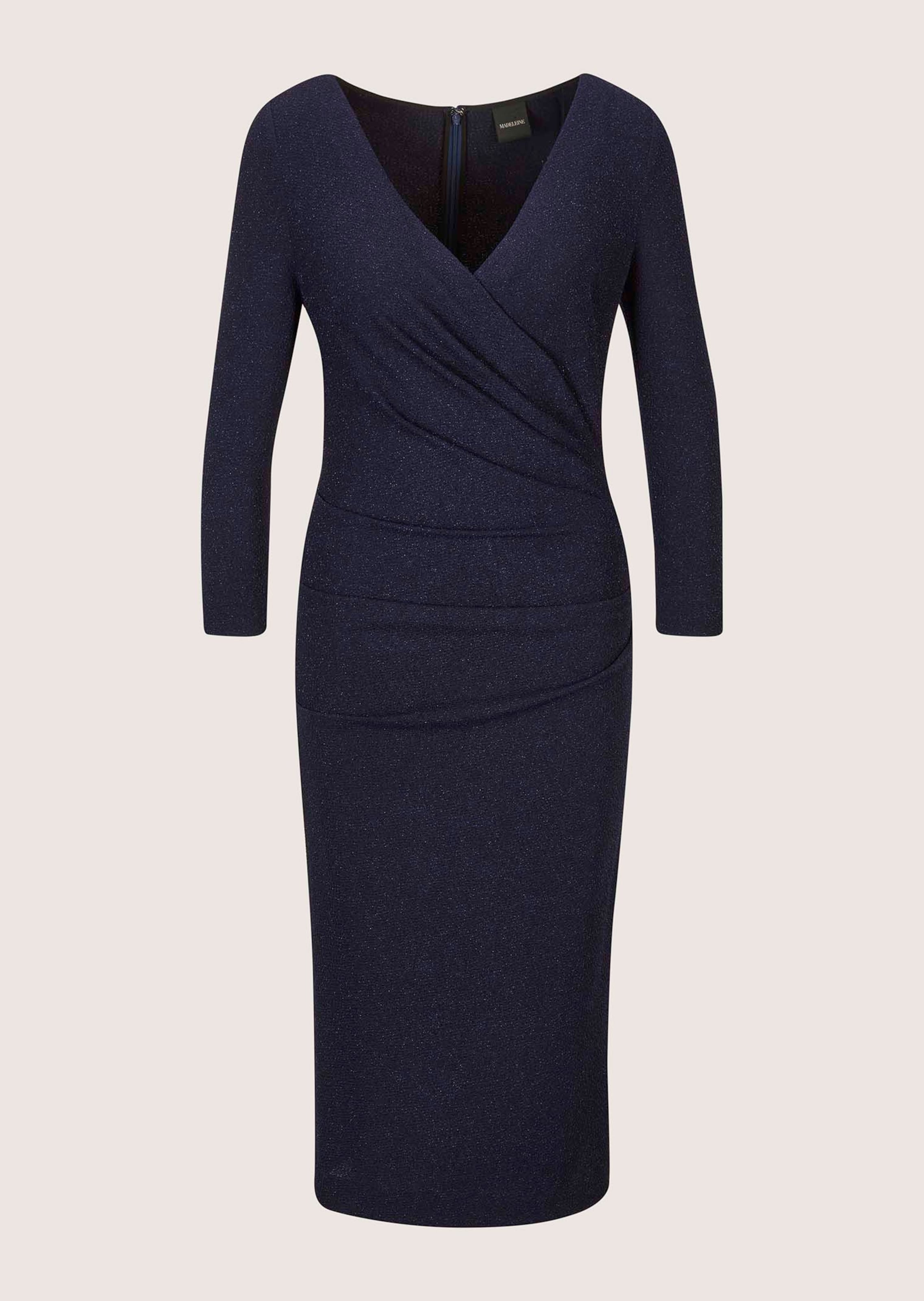 Dieses Kleid überzeugt mit seiner Wickeloptik und einer sanften Drapierung, die die Figur schmeichelnd in Szene setzt. Der V-Ausschnitt verlängert optisch das Dekolleté, während der 3/4-Arm den Arm angenehm bedeckt. Die knieumspielende Länge macht das Etuikleid vielseitig tragbar. Durch das leicht schimmernde Material ist es ideal für festliche Anlässe wie Abendveranstaltungen oder Familienfeiern. Der Reißverschluss im Rücken sorgt für bequemes An- und Ausziehen.