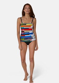 Luxuriöse Beachmode mit Gute Laune-Garantie! Mit einem modischen Grafik-Print im Oberteil zeigt dieser Topkini viel Wirkung und stimmt auf einen farbenfrohen Sommer ein. Rücken und Träger sind in uni Schwarz gestaltet. Die feminine Bandeau-Form ist mit und ohne verstellbare Träger tragbar. Dabei sorgen eingearbeitete Funktions-Details wie Formbügel und ein Unterbrustband für idealen Komfort – auch für die größere Büste. Edles Extra: die kleine Féraud-Metallplakette. Das klassisch geschnittene Höschen in Unifarbe macht den Bade-Zweiteiler komplett.