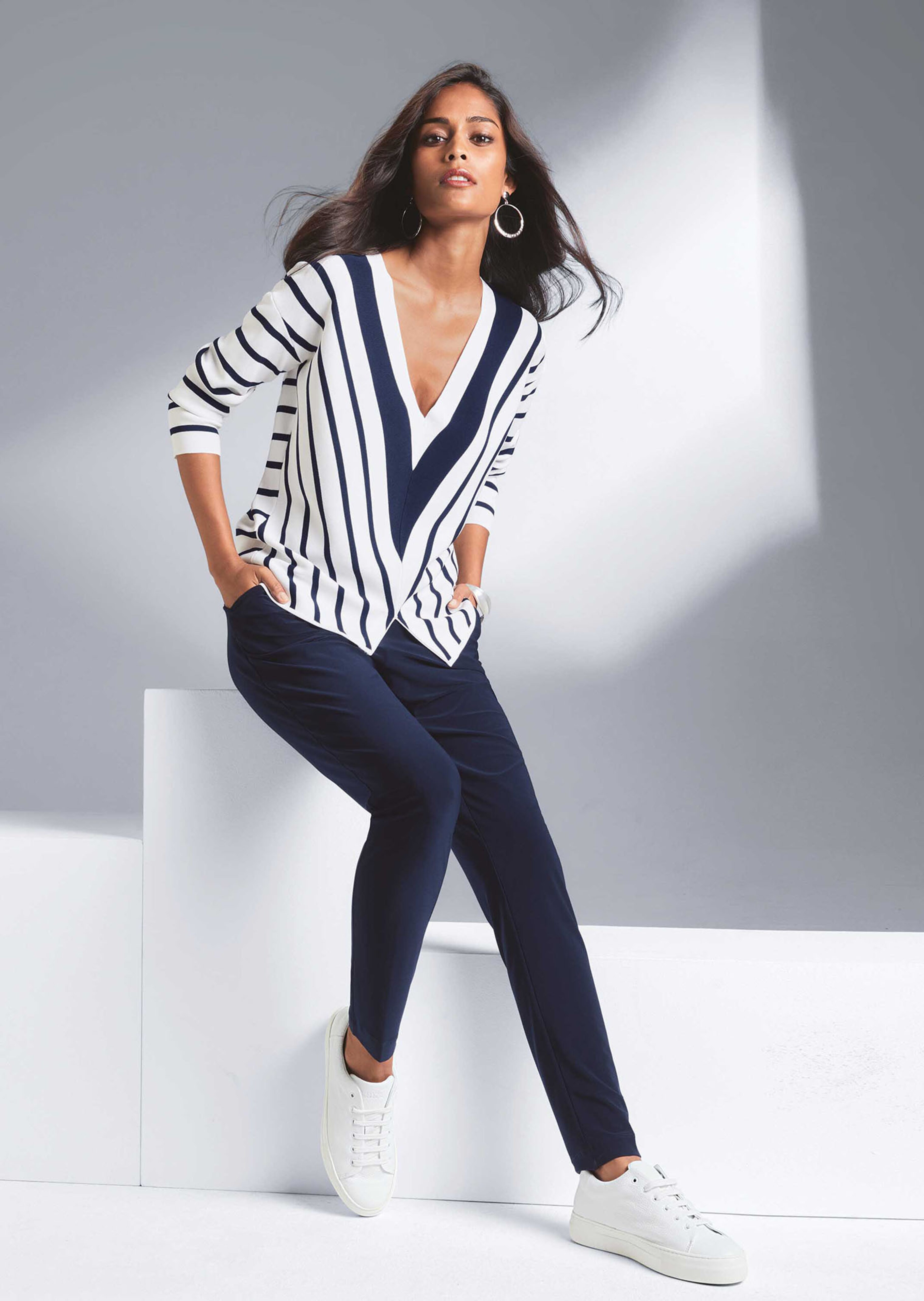 Das V steht hier markant im Fokus! Der elegante Kontraststreifen folgt dem tiefen Ausschnitt, von unten kommt ein kleiner V-Schlitz entgegen. Wir haben den gestreiften Strickpullover für einen modernen Look mit überschnittenen Schultern und Langarm in Form stricken lassen. Der Horizontalstreifen im Rücken setzt einen schönen Dessinkontrast. Sein elastischer Strick mit feinem Maschenbild trägt sich angenehm durch den Viskose-Mix. Dank der Farbkomposition können Sie ihn gut zu Klassikfarben kombinieren.