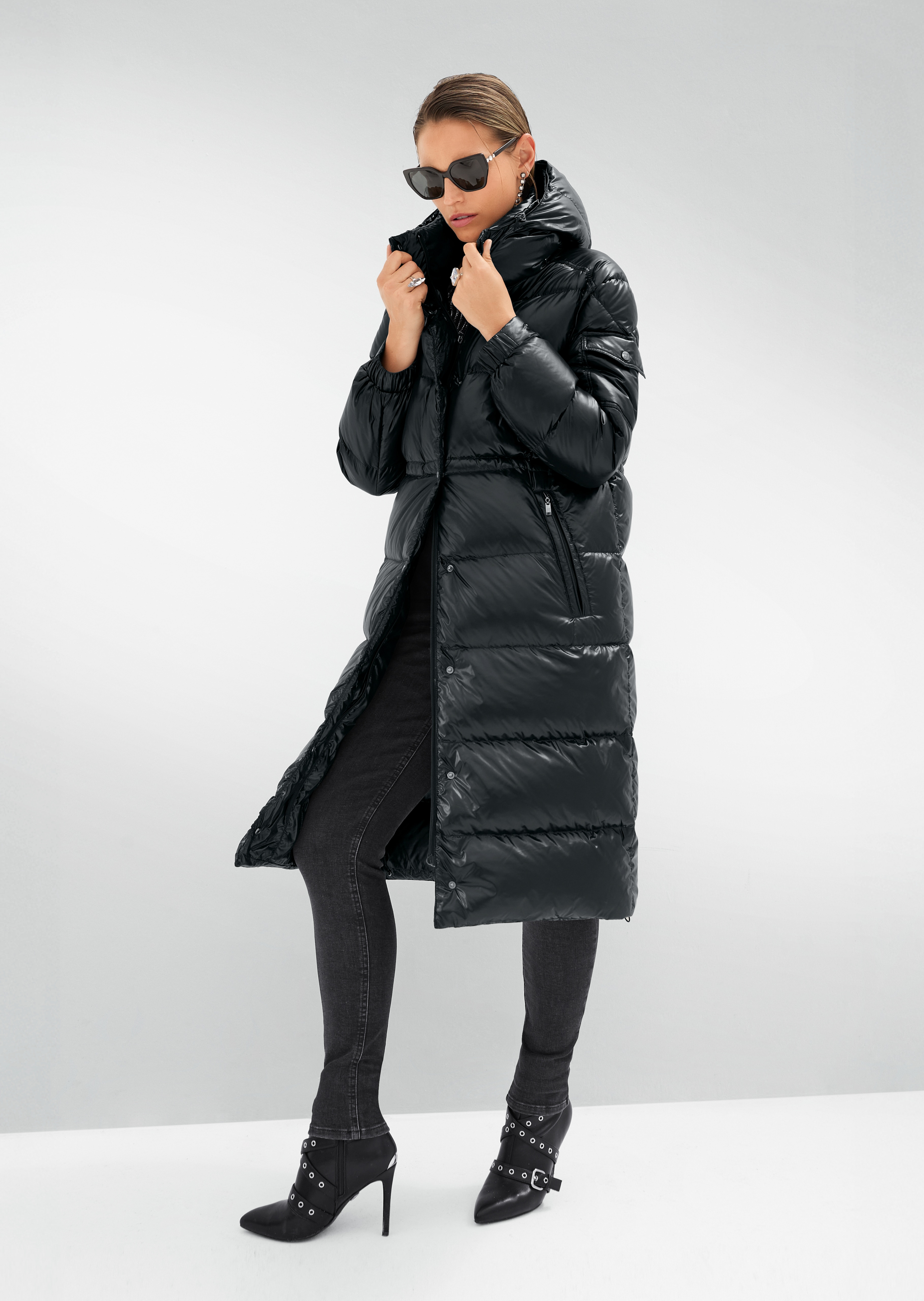 Funktion trifft modischen Feinsinn. Hochwertiger Sandwich-Stepp, zart glänzend und mit dezenter Wattierung zeigt sich hier in langer, gerader Silhouette. Ein trendstarker Begleiter für kühle Tage, der eine klare Linie zeigt. Der hohe Stehkragen des Mantels schützt zuverlässig vor Wind, während die abnehmbare Kapuze mit Bändchendurchzug individuell regulierbar ist und weiteren Schutz bietet. Eine vorderseitige Druckknopfleiste mit verdecktem Zwei-Wege-Reißverschluss lässt kalter Zugluft keine Chance und unterstreicht die durchdachte Funktionalität des Designs. Zwei weich gefütterte Reißverschluss-Taschen wärmen die Hände, während Ärmeltasche und Innentasche ein Plus an Stauraum bieten. Das flexible Taillen-Zugband bietet Gestaltungsmöglichkeiten von feminin bis locker, je nach Lust und Laune. Ein Steppmantel zwischen sportivem Chic mit wohldosierter Eleganz – vom Stadtspaziergang bis zum Weg ins Wochenende.