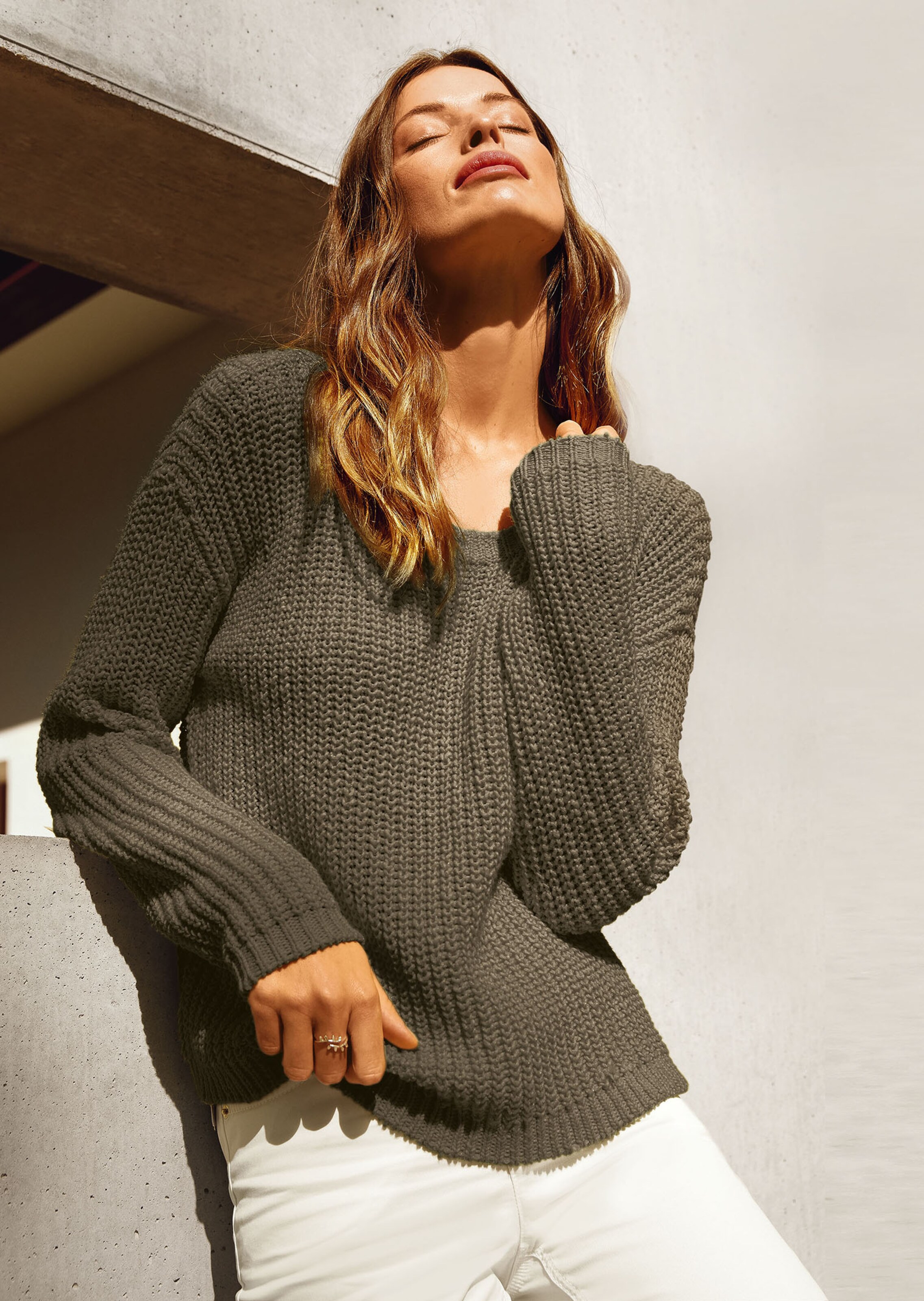 Sein natürlicher Garnmix und die grobe Maschenstruktur machen den Pullover auch an heißeren Tagen zu einem begehrten Modepartner, der lässig wie auch elegant kombiniert werden kann. Baumwolle und Leinen überzeugen mit angenehm kühlem Trage-Gefühl und lassen viel Luft an die Haut. Die lässige Form des Modepartners umspielt leicht die Figur und wurde aufwendig in Form gestrickt. Rundhals-Ausschnitt, überschnittene Schulterpartien und Saumkante sind mit formstabilen Rippstrick-Blenden gearbeitet und runden den Look in klassischer Manier ab.