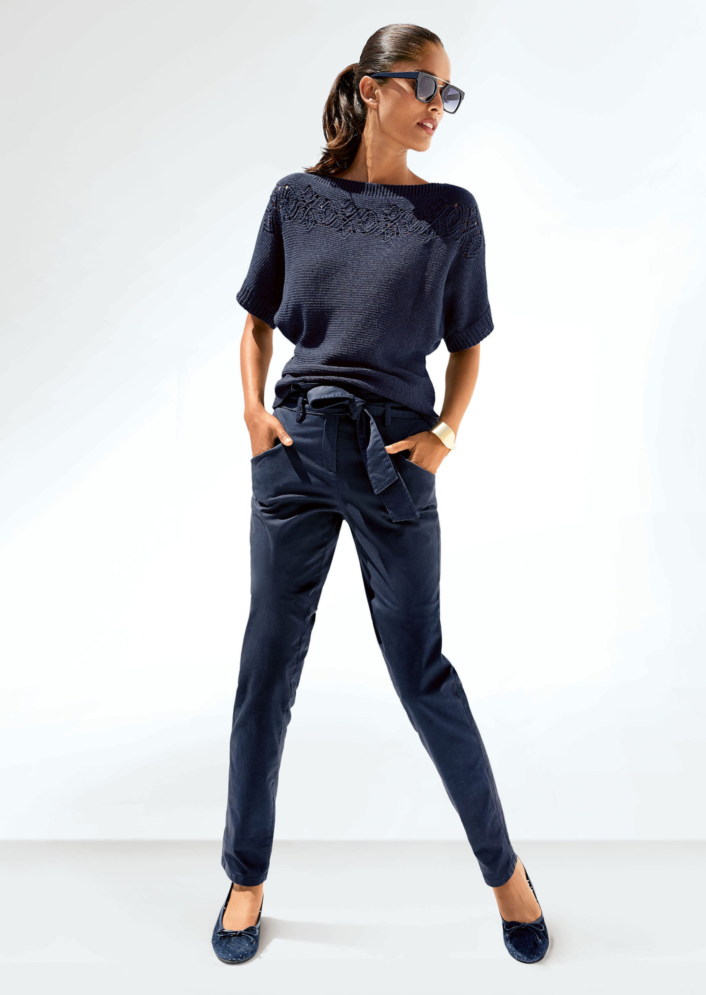 Seine zauberhafte Optik und das luftig leichte Trage-Gefühl machen den Pullover zu einem echten Lieblingsstück. Filigran gearbeitetes Ajour-Muster setzt Dekolleté- und Schulterpartie mit liebevollem Charme in Szene und lässt dabei verführerisch Haut durchschimmern. Die Garnmischung mit natürlicher Baumwolle verwöhnt mit angenehm kühlem Griff und garantiert puren Mode-Genuss. Horizontal gestrickt begeistert das Maschen-Highlight in modisch legerer, formschöner Silhouette und umspielt locker und luftig die Figur. Die halblangen, überschnittenen Ärmel werden wie der Saum von einer formstabilen Rippenblende eingefasst. Ein flacher U-Boot-Ausschnitt rundet das edle Stück gekonnt ab.