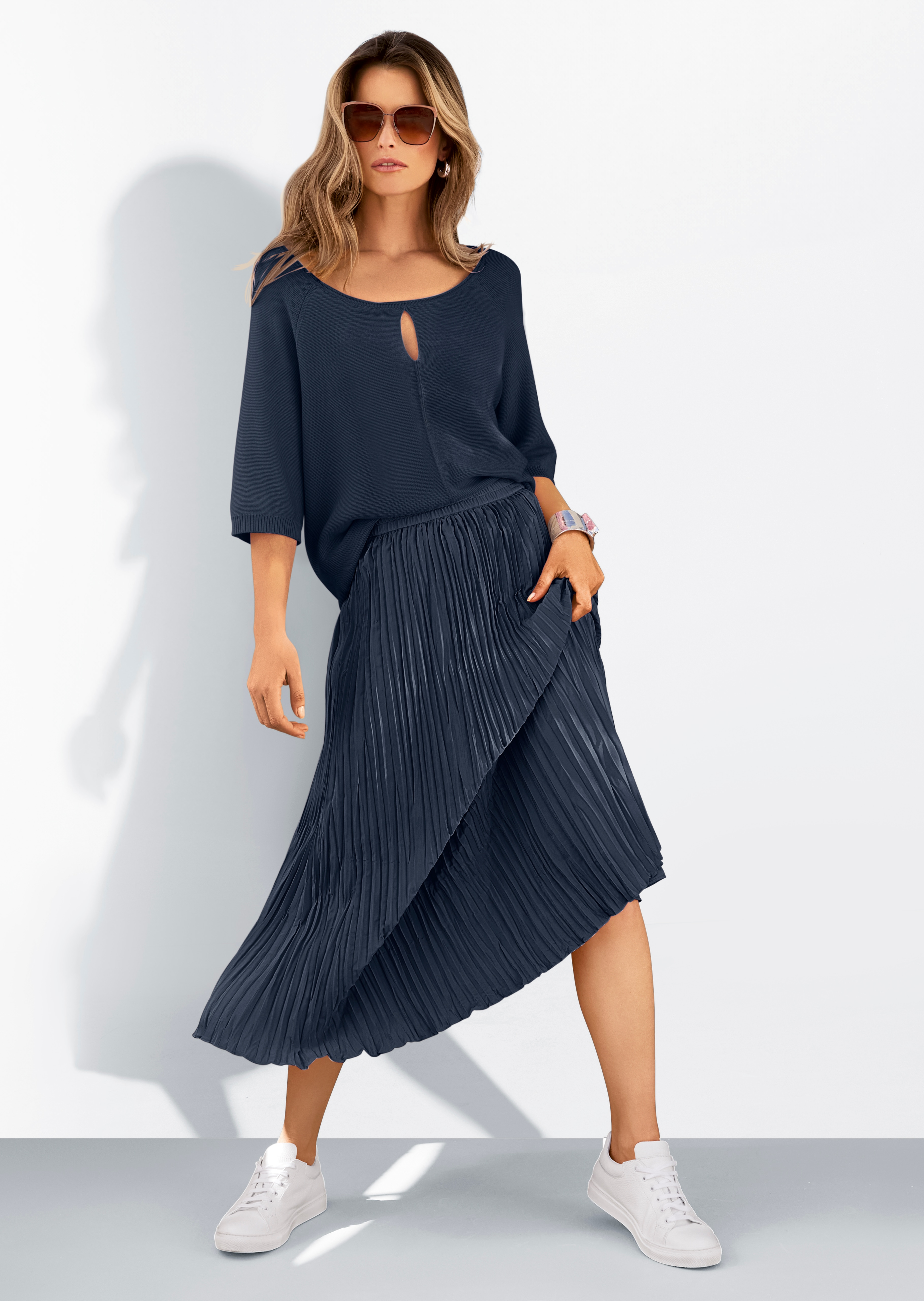 Coole Maschen haben auch im Sommer Konjunktur! Die kurze, kastige Form mit halblangen Raglanärmeln macht den Struktur-Pullover zu einem echten It-Piece und überzeugt mit liebevoller Detailarbeit. Der Rundhals-Ausschnitt mit Dekolleté-Schlitz schließt wie der Body mit einer edlen Rollkante ab. Vorder- und Rückseite erhalten durch die mittige Längsnaht ein Plus an Modernität.