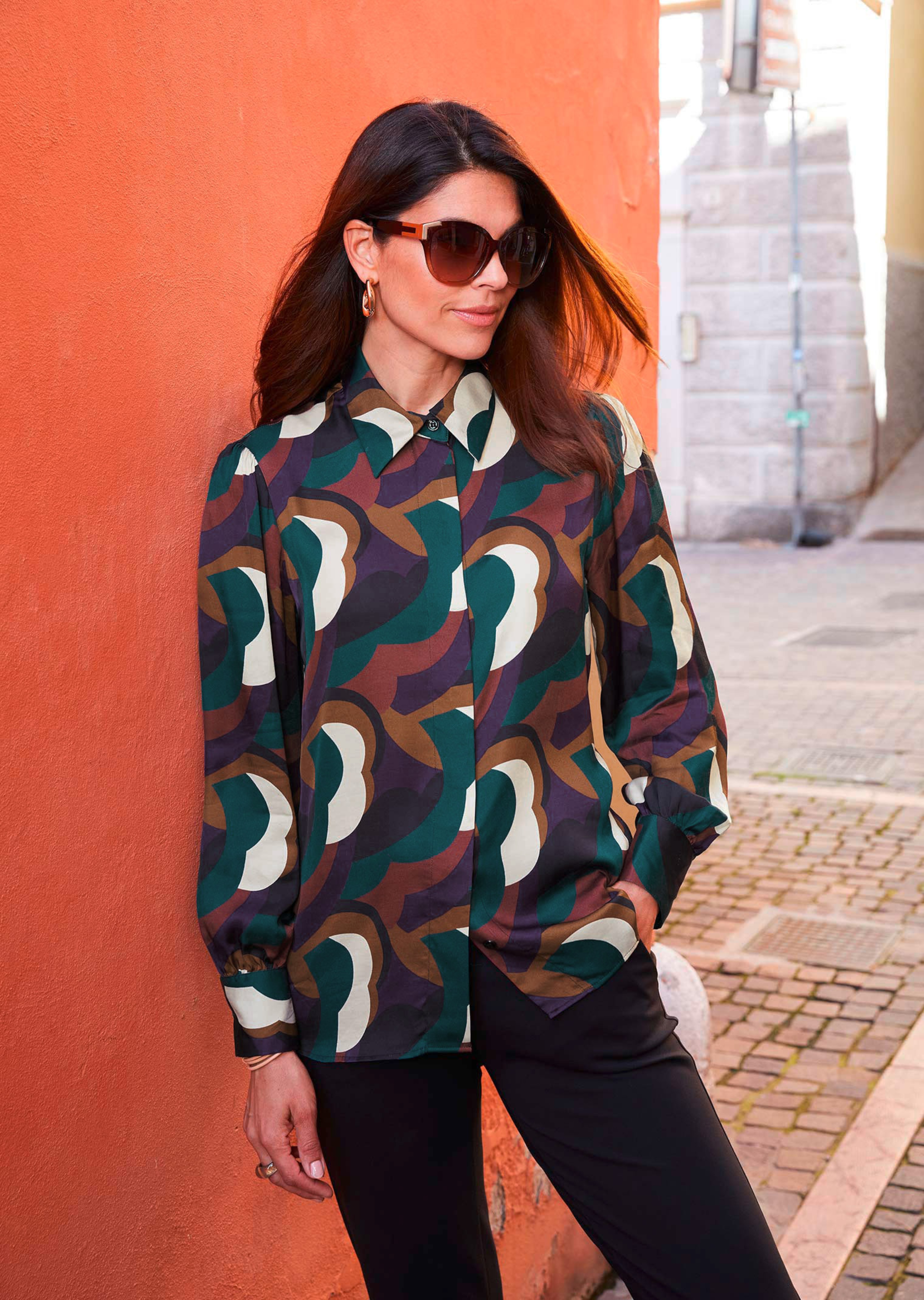 Die Hemdbluse von SEIDENSTICKER in grafischem Alloverprint wirkt sehr elegant. Das liegt zum einen an der weich fließenden Satinqualität aus Viskose, die seidig glänzt. Zum anderen verleiht auch der klassische Schnitt mit verdeckter Knopfleiste und großen Volumenärmeln mit 2-Knopf-Manschetten eine edle Optik. Das Rückteil ist mit einer Passe und zwei eingelegten Falten gearbeitet für eine schöne Mehrweite. Zudem ist es etwas länger geschnitten als das Vorderteil. Mit leicht gerundeten Säumen ein schönes Modell mit vielen Styling-Möglichkeiten. Länge in Gr. 38 ca. 66 cm. Styling-Tipp: Die Satinbluse ist ein edler Hingucker und entfaltet seine Wirkung am besten mit eleganten Hosen oder Röcken. High Heels dazu und Sie sind bereit für Ihren stilvollen Auftritt!