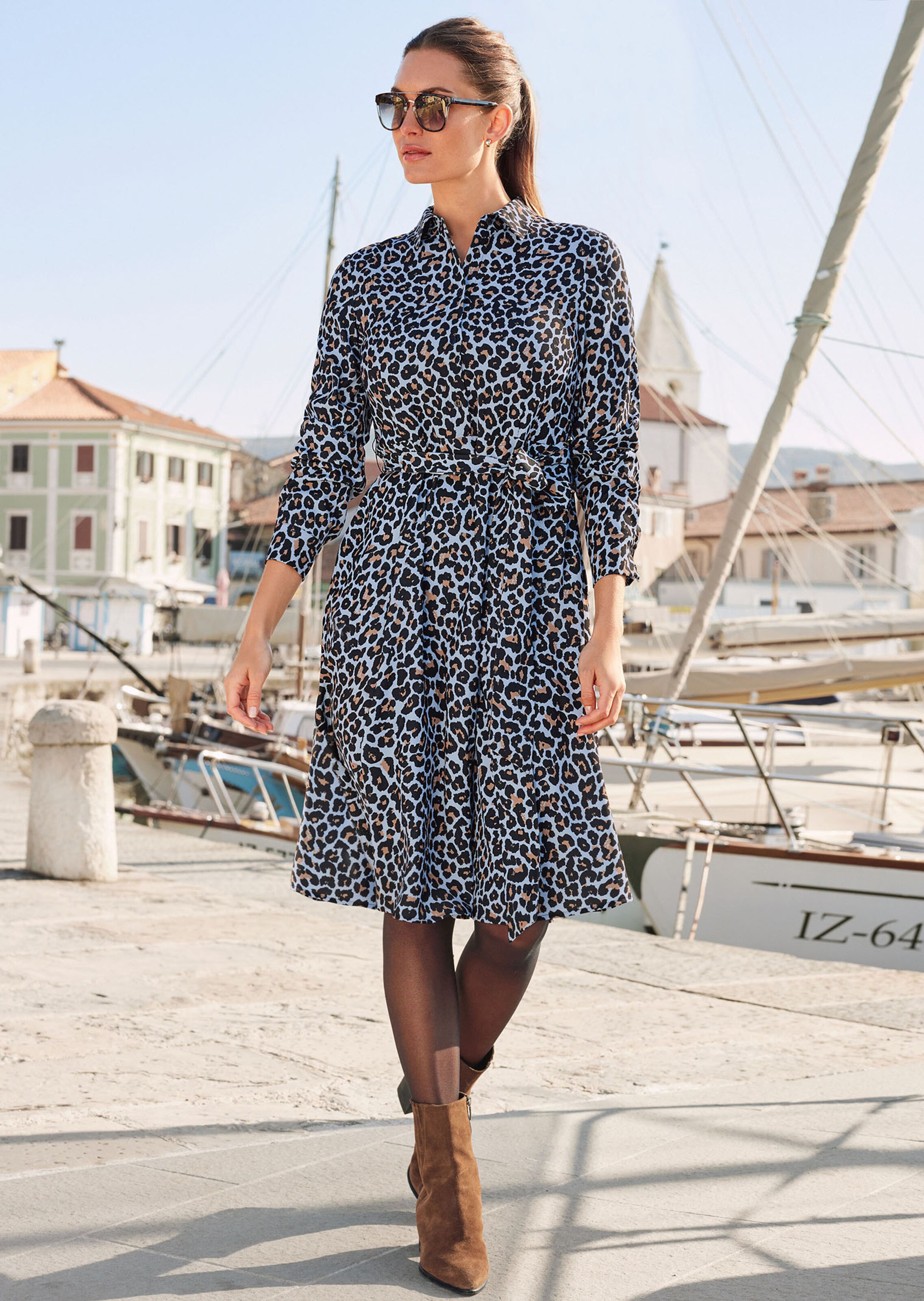 Auch Casual-Styles können nie genug von femininem Chic haben. Der Animal-Print des Kleides bildet einen spannenden Kontrast zur reizvoll taillierten Silhouette und verleiht ihm die trendstarke Aussage. Das Hemdblusenkleid ist bis zur Taille durchgeknöpft und setzt diese durch ein Bindeband aufregend in Szene. Klappkragen und lange Manschettenärmel runden den Style gekonnt ab.
