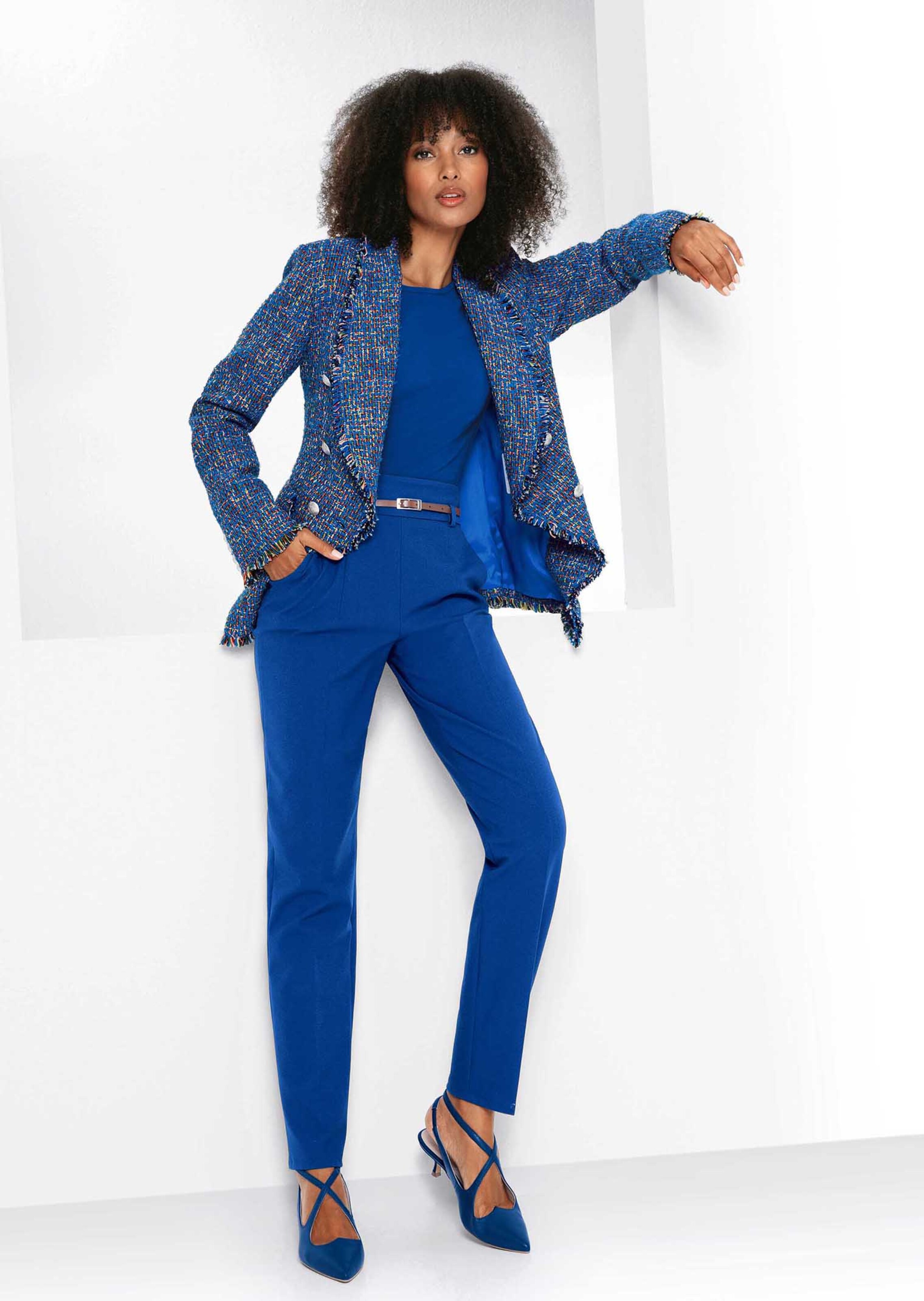 Von elegant bis festlich – die neue, schmale Highwaist-Hose in knöchellanger Form ist ein adäquater Styling-Partner. Stilsicher verarbeitet in edler Qualität mit nachhaltigen Viskosefasern der Marke LENZING™ ECOVERO™. Mit Bundfalten, Eingrifftaschen und breitem Bund mit Gürtelschlaufen und schmalem Lederimitat-Gürtel zeigt sie moderne Akzente. Durch die pflegeleichte Qualität ist die Businesshose schnell wieder in Form gebracht und bereit für neue Anlässe und Termine. Der hohe Bund wird zu schmalen Oberteilen kombiniert, die gerne auch eingesteckt werden dürfen. Die Kombination der Knöchellänge und des hohen Bundes prägt den Trendstyle und macht sie zu einem Must Have der trendigen City- und Businessgarderobe. Zwei Größenläufe werden auch den Anforderungen kleinerer Frauen gerecht. Klassisch in der Farbgebung lässt sich die Highwaist-Hose vielseitig kombinieren.