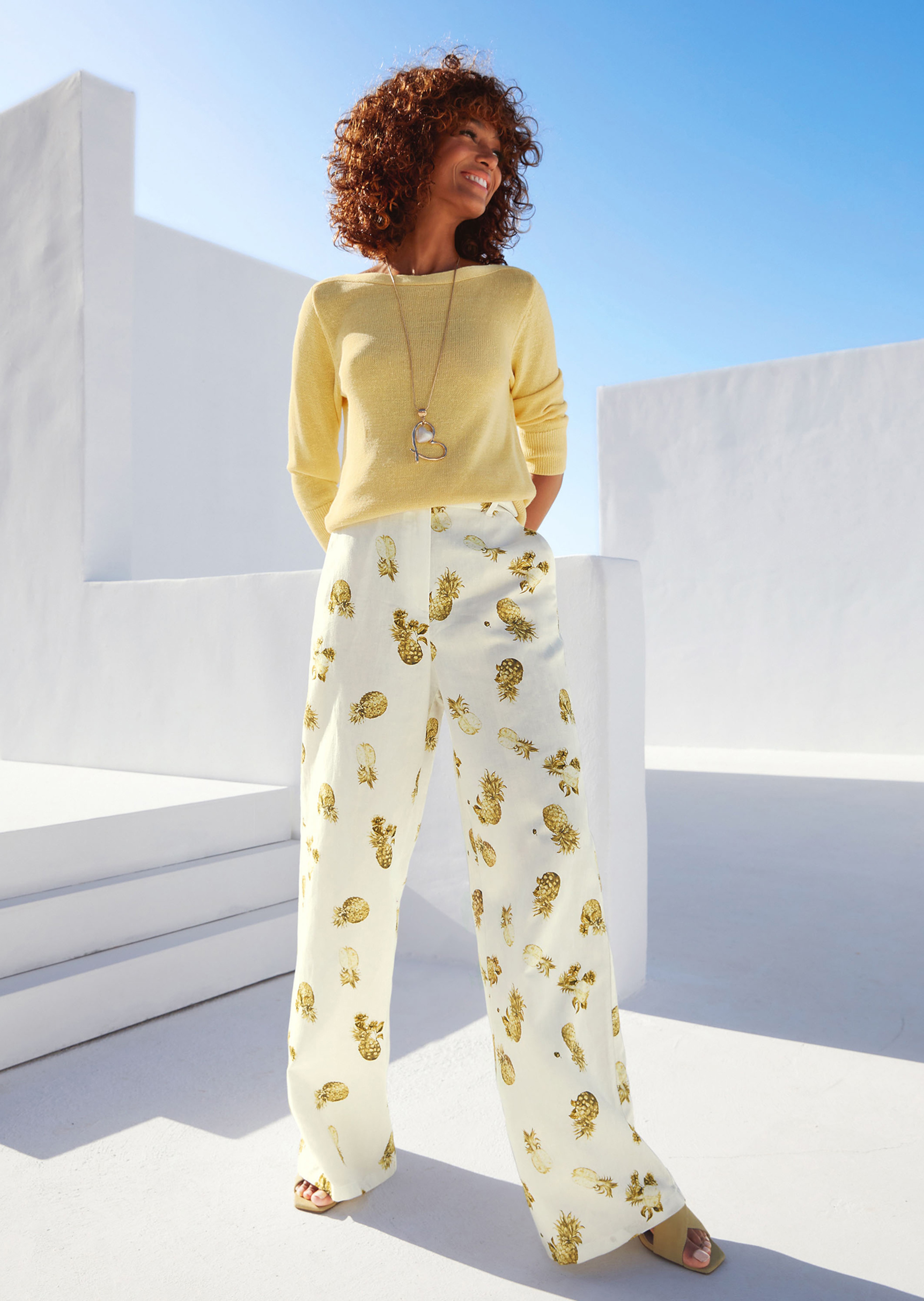 Appetit auf edel-lässige Stylings? Die Hose mit Ananas-Muster lässt sich durch ihre Farben schön zu hellen Tönen kombinieren. Der Print macht aus jedem Stück ein Unikat. Im Detail ist sie gestaltet mit weitem Bein, Formbund, M-Logoknopf, Gürtelschlaufen und Schubtaschen.
