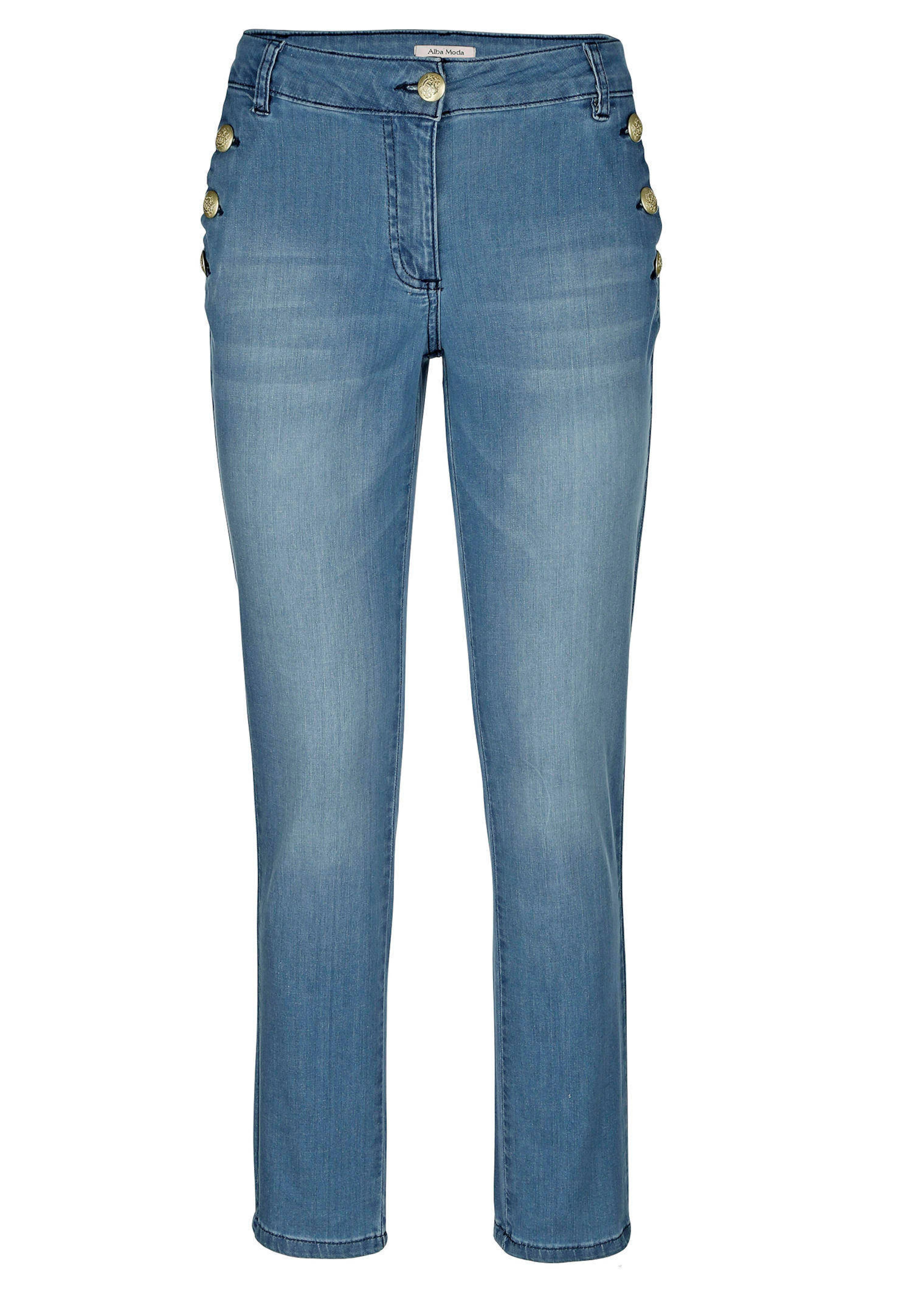 Diese Regular-Fit Jeans kombiniert klassischen Denim-Style mit modischem Chic. Der Schnitt mit hoher Leibhöhe sorgt für angenehmen Sitz, während goldfarbene Knöpfe an den Seiten stylische Akzente setzen. Dank Formbund und bequemem Materialmix sitzt sie perfekt. Ob casual mit Top oder elegant mit Bluse – diese Jeans ist vielseitig kombinierbar und ein echtes Must-have. Beininnenlänge in Gr. 38 ca. 74 cm.