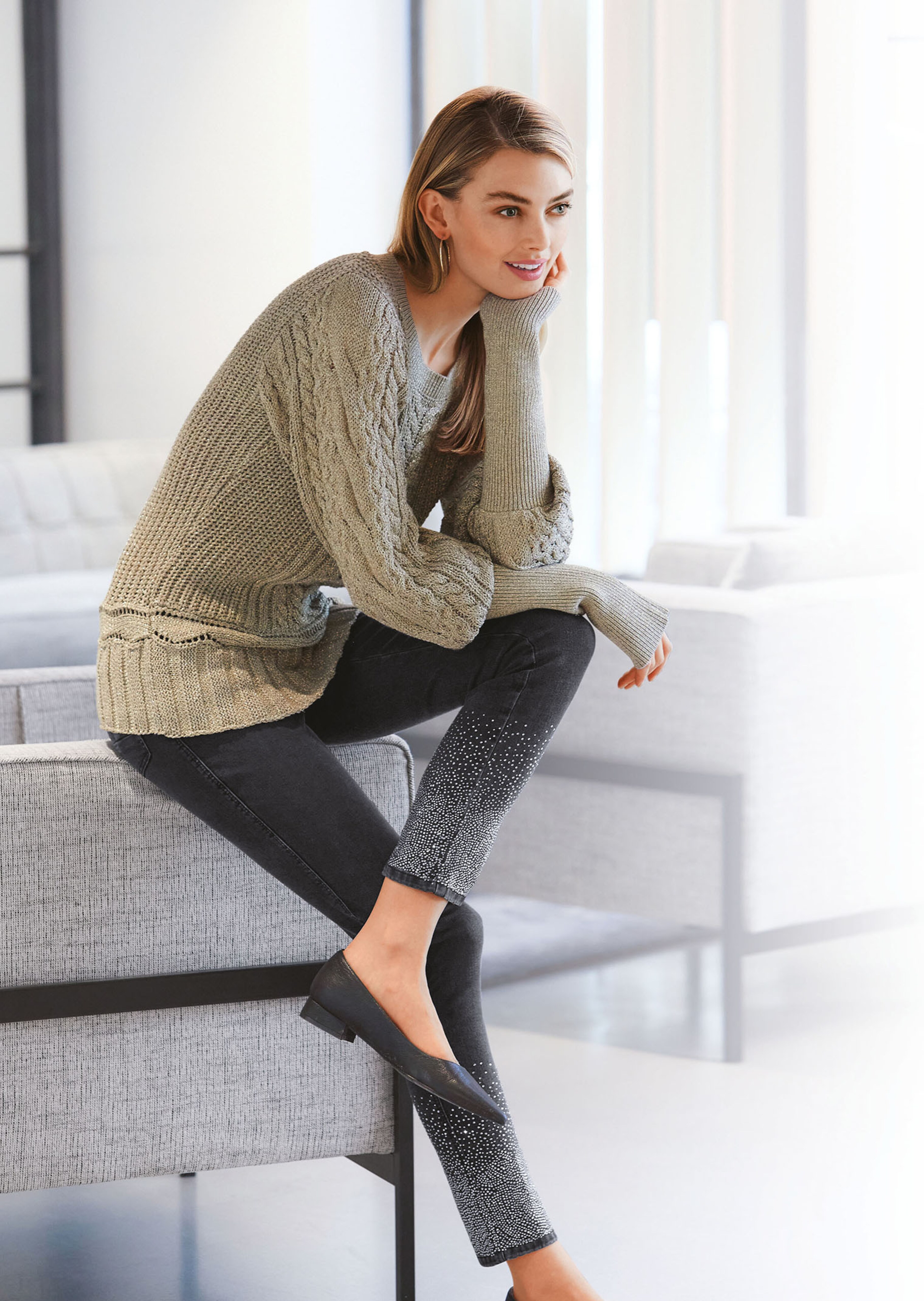 Ein fantastischer Effekt: Die Jeans mit Ziersteinchen in nachhaltiger Waschung zeigt den wertvollen Schmuck am Saum. Der schlanke, knöchellange 5-Pocket-Style zeichnet in angesagter Slimline eine fantastisch schmale Linie und überzeugt mit knackigem Sitz. Ausgestattet ist sie mit Formbund, vorderseitiger, doppelter Bundoptik, Gürtelschlaufen, M-Logo-Knopf, rückseitiger, v-förmiger Passe, Schubtaschen und aufgesetzten Gesäßtaschen. Durch den kostbar gestalteten Saum bietet sie sich auch als Abendhose an. Dank zusätzlicher Kurzgrößen können sie auch kleine Frauen prima tragen.