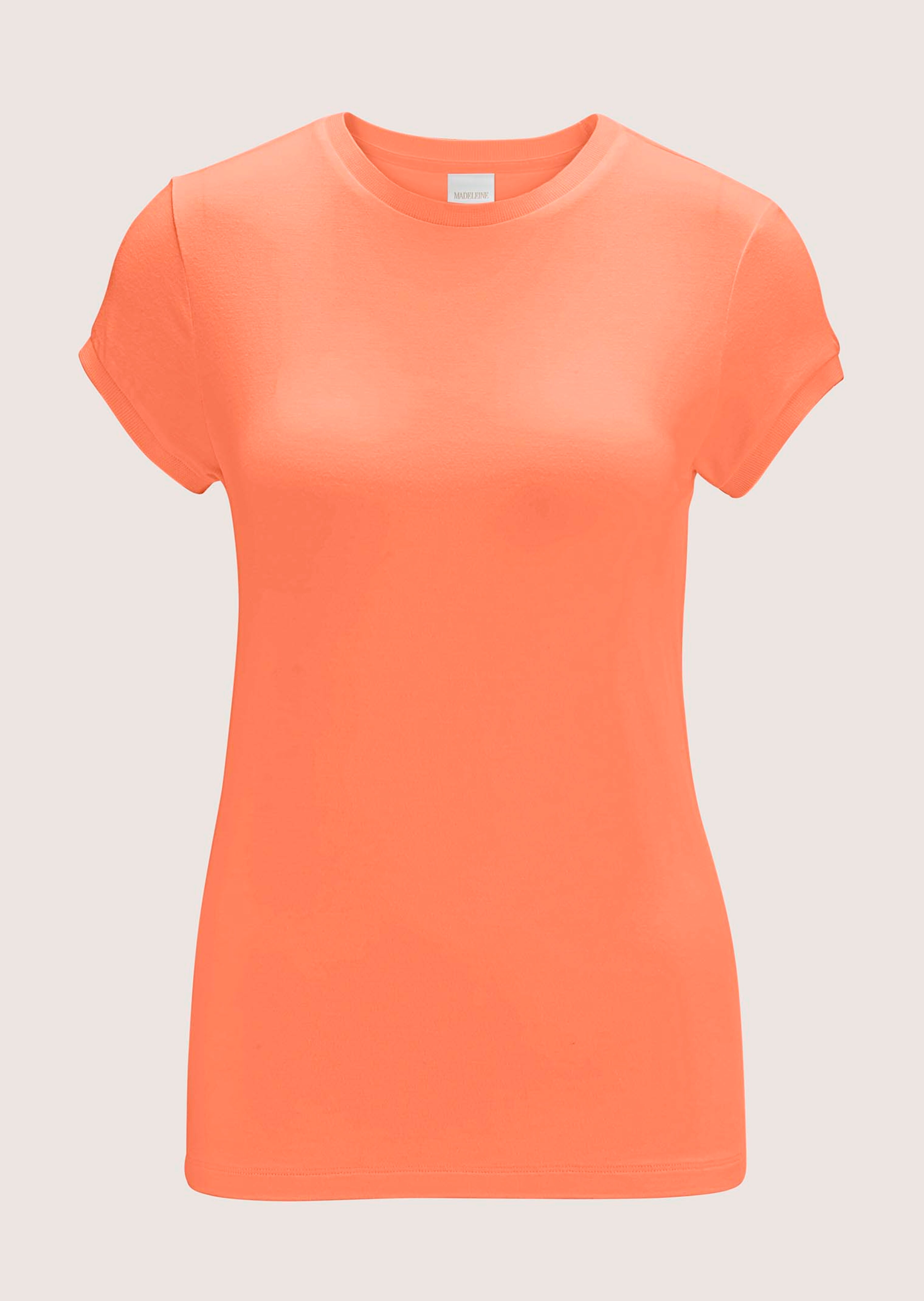 Ein Shirt, das vielseitig kombiniert werden kann und sowohl darunter, als auch solo getragen eine gute Figur macht. Die weich fließende Jersey-Qualität des Trendbegleiters ist sehr angenehm im Trage-Gefühl und sorgt dank Stretch-Anteil für zusätzlichen Komfort. Der Rundhals-Ausschnitt und die kleinen Kapp-Ärmel des taillierten Styles sind mit kleinen Rippenbündchen gearbeitet.