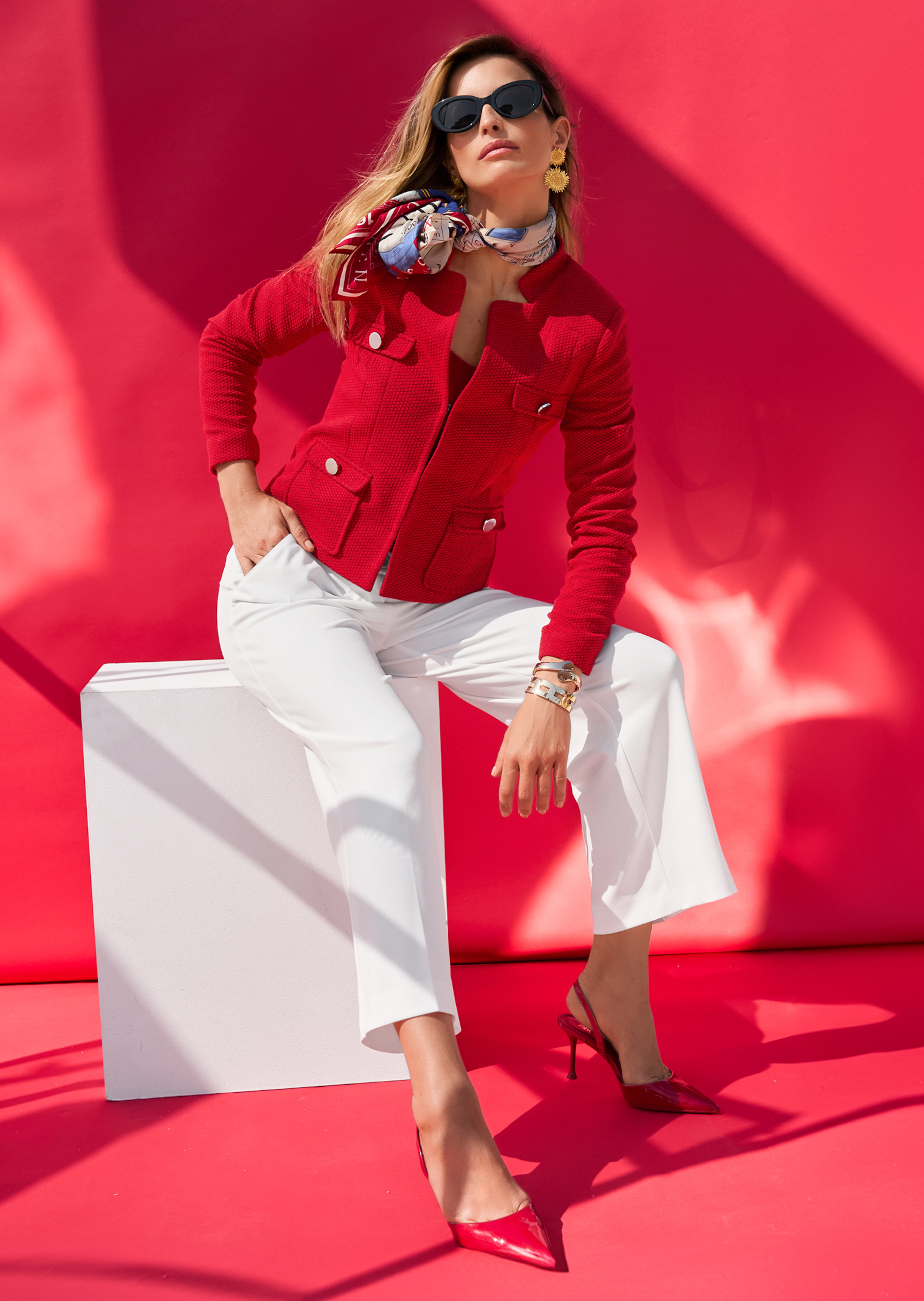 Der wertvolle Struktur-Jersey dieses Blazers bietet dank Stretch-Anteil bequemen Trage-Komfort und zeigt sich in trendstarker Kurzform. Ein modisch souveräner Look, der Schwung ins Spiel bringt und von lässig bis elegant kombiniert werden kann. Ein kleiner Stehkragen, die formgebende Schulterpasse und kleine Pattentaschen mit Knopf runden den Style in liebevoller Manier ab.