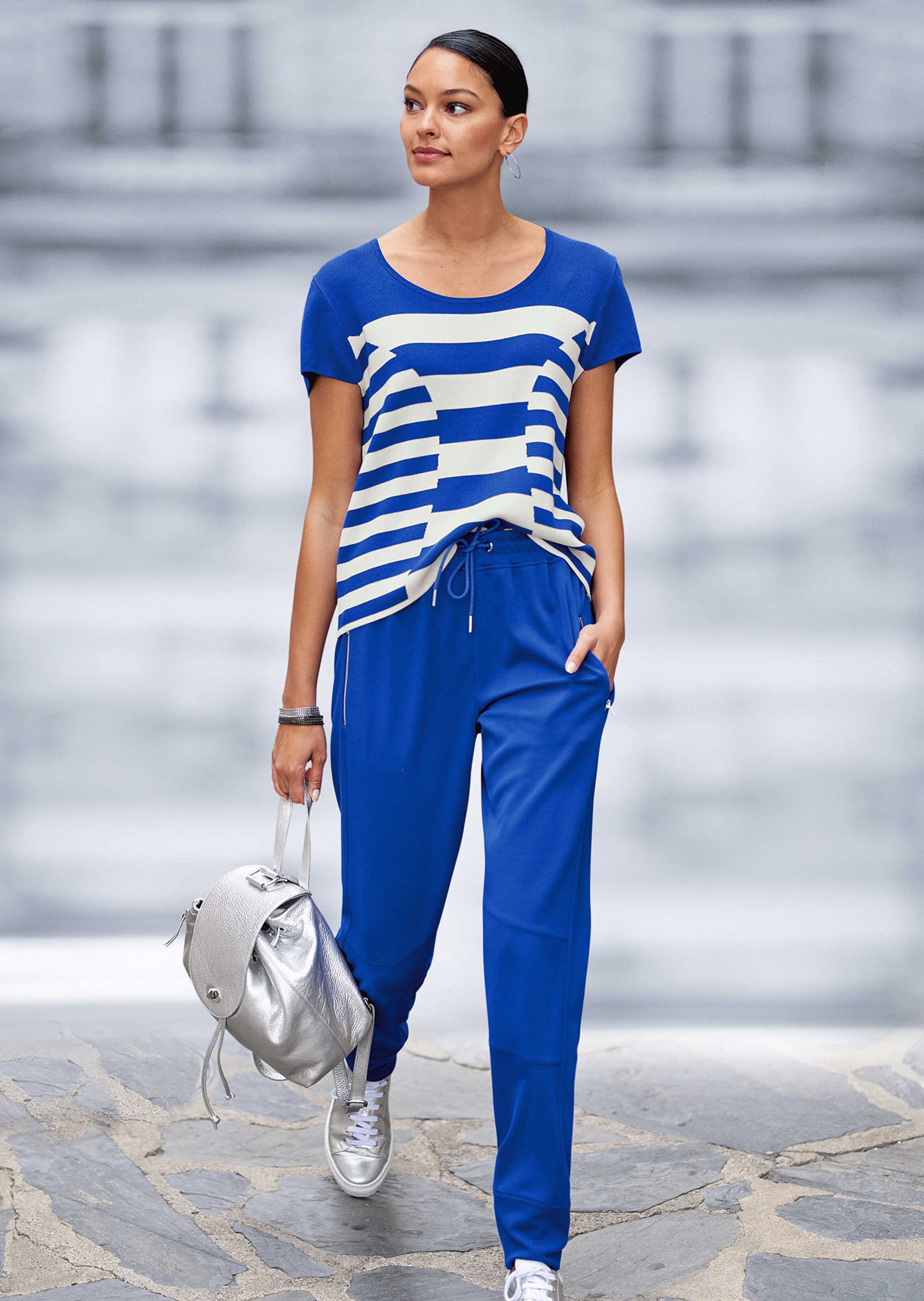 Die perfekte Hose für Ihr Home-Office! Die Jogg-Pants mit Reißverschlusstaschen trägt sich herrlich bequem und lässt sich ganz trendy auch mit eleganten Partnern kombinieren. Wir haben die bequeme Schlupfhose in lässiger, knöchelfreier Form mit dezenter Struktur, Zippertaschen und tonig abgestepptem Elastikbund mit Kordeldurchzug gestaltet. Die elastische Qualität mit weichem, kühlen, glatten Griff trägt sich wunderbar angenehm. Durch zwei Größenläufe mit zusätzlichen Kurzgrößen können sie auch kleine Frauen prima tragen.