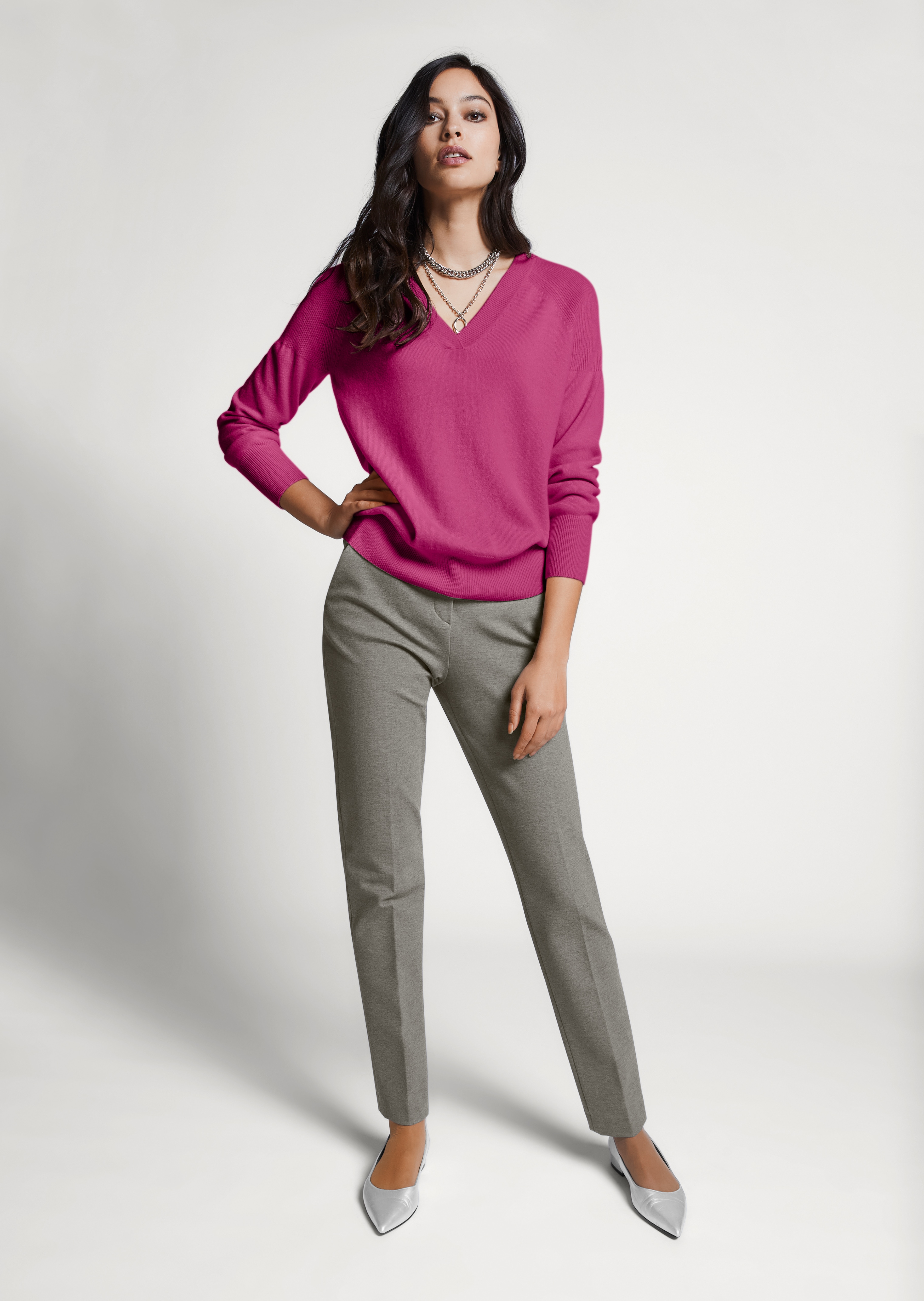 First Class-Strick für viele Gelegenheiten. Das flauschig weiche Tragevergnügen und die wunderbare Leichtigkeit sind das Geheimnis der feinen Kaschmir-Qualität – zweifädig versponnen schenkt sie ein besonders edles Maschenbild. Ein Wohlfühlerlebnis der exklusiven Art! Perfekt für einen edlen Basic-Pullover, an dem Sie bestimmt länger als eine Saison Ihre Freude haben werden. Mit feinen Rippstrick-Partien auf der Schulter sorgt der Pullover auch modisch für das gewisse Etwas. Aufwendig in Form gestrickt zeigt er sich in moderner, lässiger Weite und ist mit überschnittener Schulter, V-Ausschnitt und gerippten Abschlüssen gestaltet.