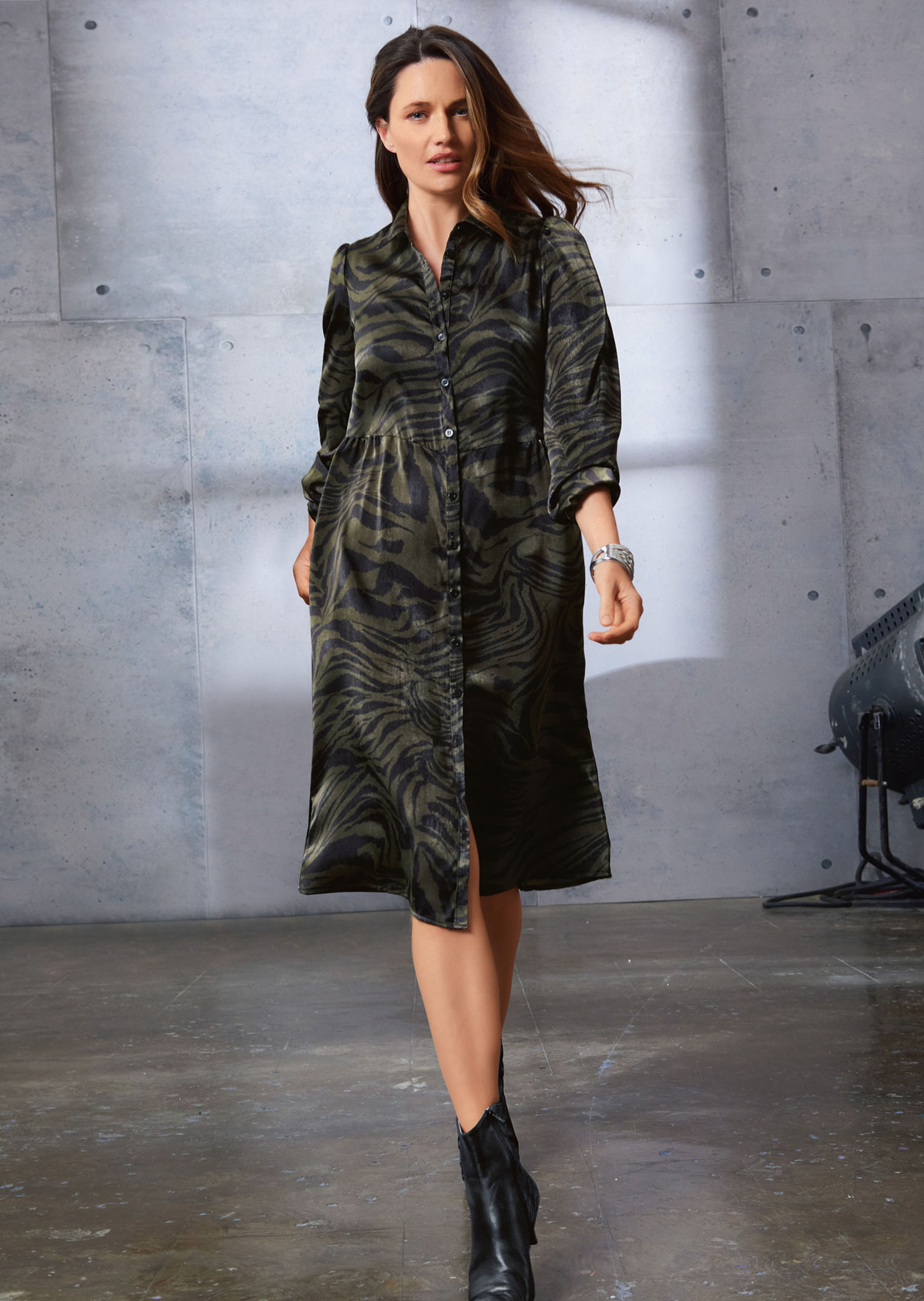 Die neuen Kleider faszinieren mit Effekten! Das Kleid mit Animalprint wirkt edel-rassig durch den Bicolour-Druck. Jedes Stück ist ein Unikat! Sein lässiger Style ist mit durchgehender Knopfleiste, Logoknöpfen und Nahttaschen gestaltet. Die langen Ärmel zeigen Volantabschlüsse. Feminine Rüschen akzentuieren Schulter und Taille. In den Größen 40 bis 48 hat das Kleid Brustabnäher.