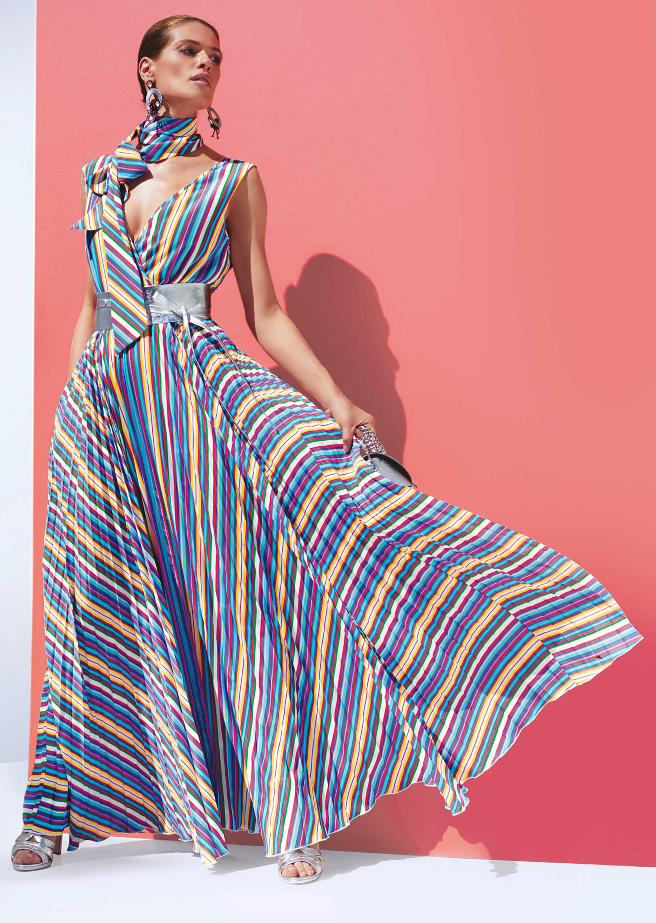 Superweit ist angesagt! Das Kleid mit weitem Rock setzt den Trend mit seiner Silhouette. Das Oberteil ist glatt gestaltet, der weit schwingende Rock mit diagonal gestreiftem Sonnenplissee. Ärmellos mit vorder- und rückseitigem V-Ausschnitt, Wickeleffekt und Taillengummizug zeichnet es eine feminine Linie. Mit Taschen, Gürtelschlaufen, Bindegürtel und verdecktem Seitenzipper zeigt es moderne Details. Das Wickeloberteil wird mit einer Druckknopfsicherung fixiert, so fällt der Ausschnitt immer optimal. Fixieren Sie die BH-Träger an den dafür vorgesehenen BH-Spangen, so sitzt das Kleid gut. Das Rockfutter ist für mehr Bewegungsfreiheit mit Seitenschlitzen gestaltet.
