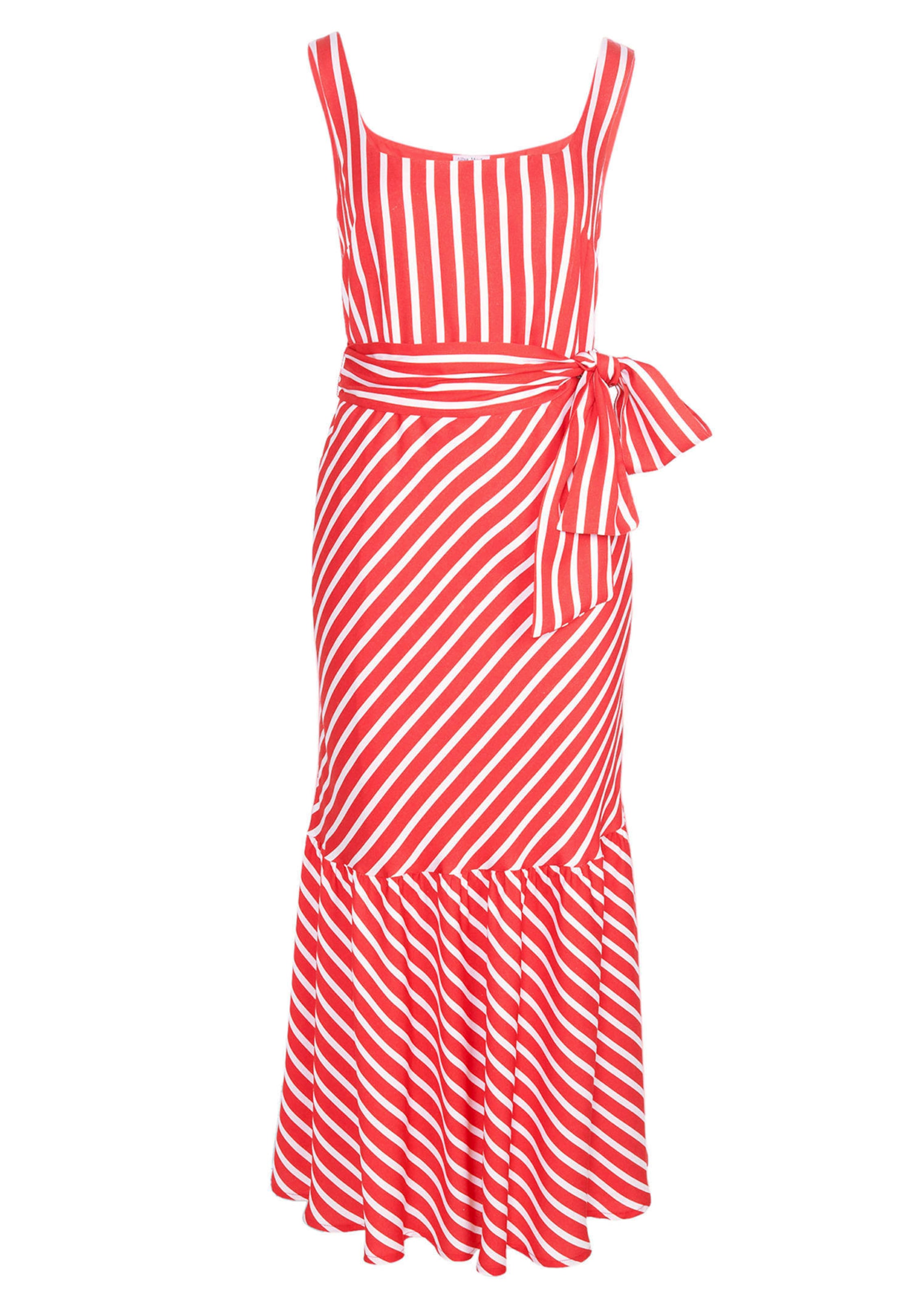Kleid mit Diagonal- und Längsstreifen. Karree-Ausschnitt. Breite Träger und Taillenbindeband. Reißverschluss in der Seitennaht. Volant am Saum. Voll gefüttert. Länge in Gr. 38 ca. 112 cm.