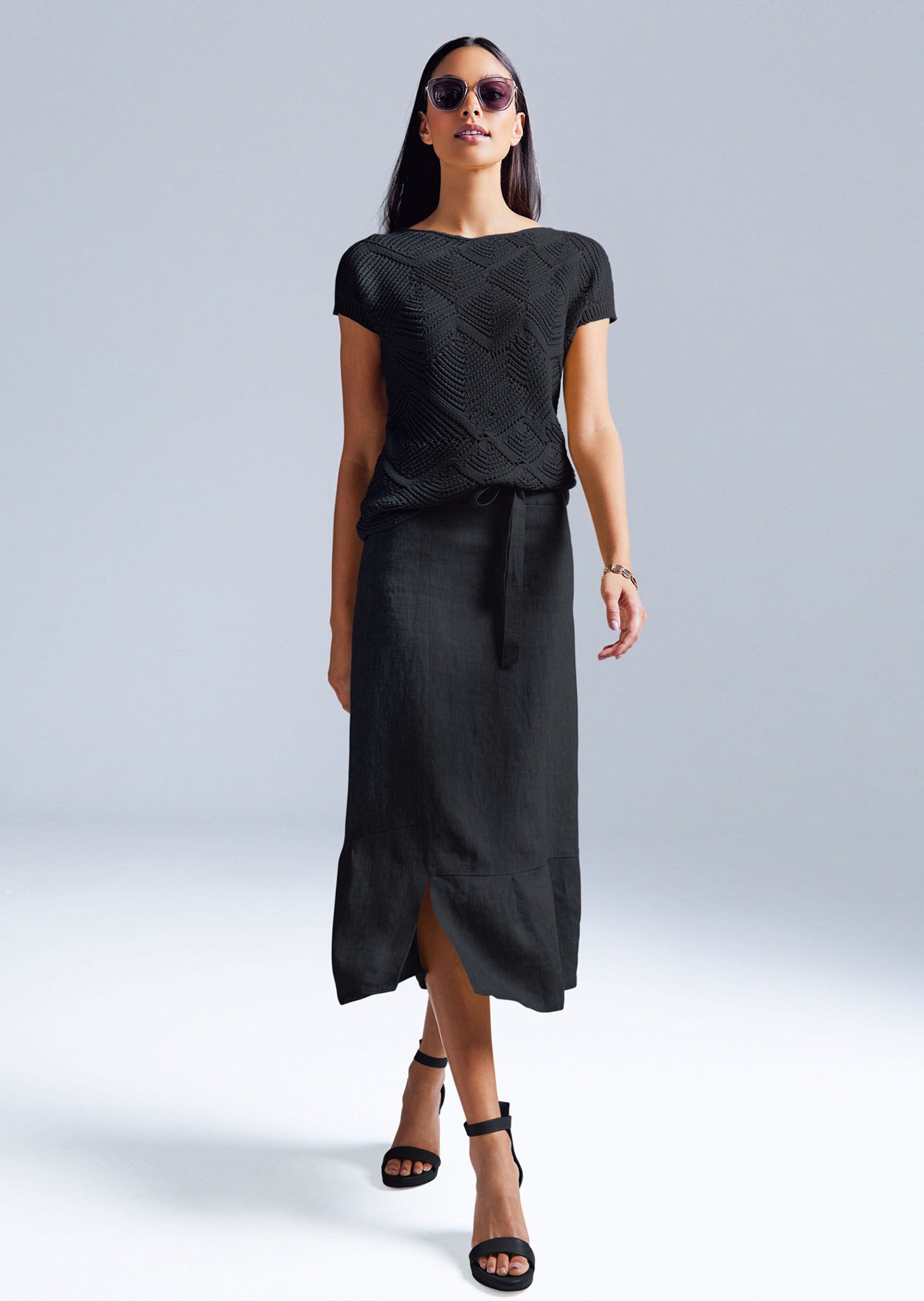 Ein Strickbegleiter, der wie gemacht ist für die warmen Tage des Jahres und dabei nichts an Modernität vermissen lässt. Das Wellenmuster des Pullovers lässt angenehm Luft zirkulieren und fasziniert mit aufregend schöner Optik. Dezent oversized umspielt er sanft die Figur und ist vielseitig kombinierbar. Rundhals-Ausschnitt und überschnittene Schultern runden den Style ab.