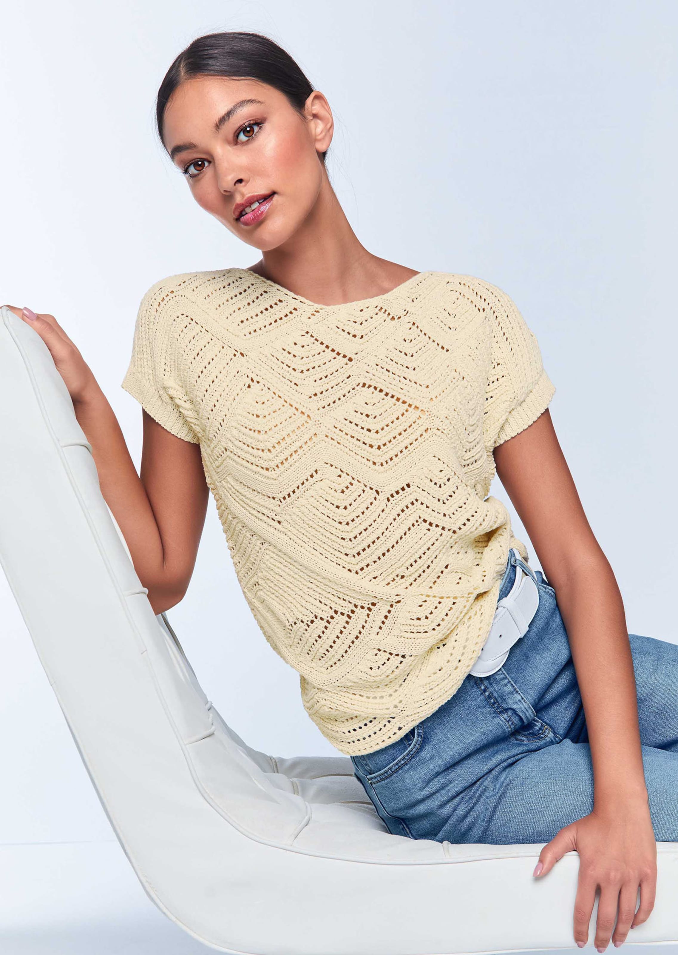 Ein Strickbegleiter, der wie gemacht ist für die warmen Tage des Jahres und dabei nichts an Modernität vermissen lässt. Das Wellenmuster des Pullovers lässt angenehm Luft zirkulieren und fasziniert mit aufregend schöner Optik. Dezent oversized umspielt er sanft die Figur und ist vielseitig kombinierbar. Rundhals-Ausschnitt und überschnittene Schultern runden den Style ab.