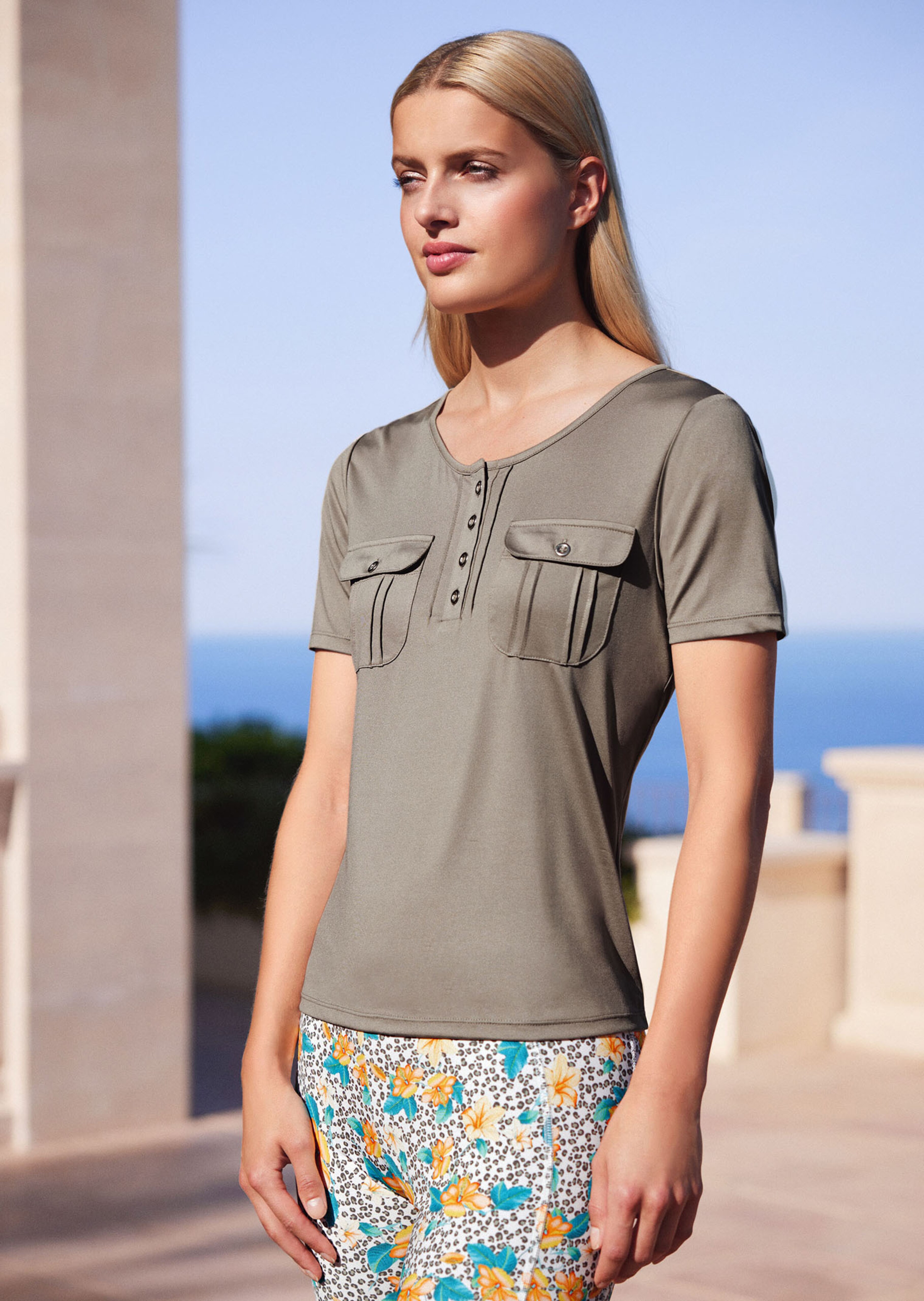 Wir lieben Shirts in allen Variationen! Mit Knopfleiste, Zierbiesen und aufgesetzten Knopf-Pattentaschen setzt sich dieses Modell neu und modern in Szene. Ein Rundhals-Ausschnitt und kurze Ärmel machen das Shirt komplett. Ein Allroundtalent, das durch die Stretchqualität herrlich trageangenehm, formstabil und pflegeleicht ist.
