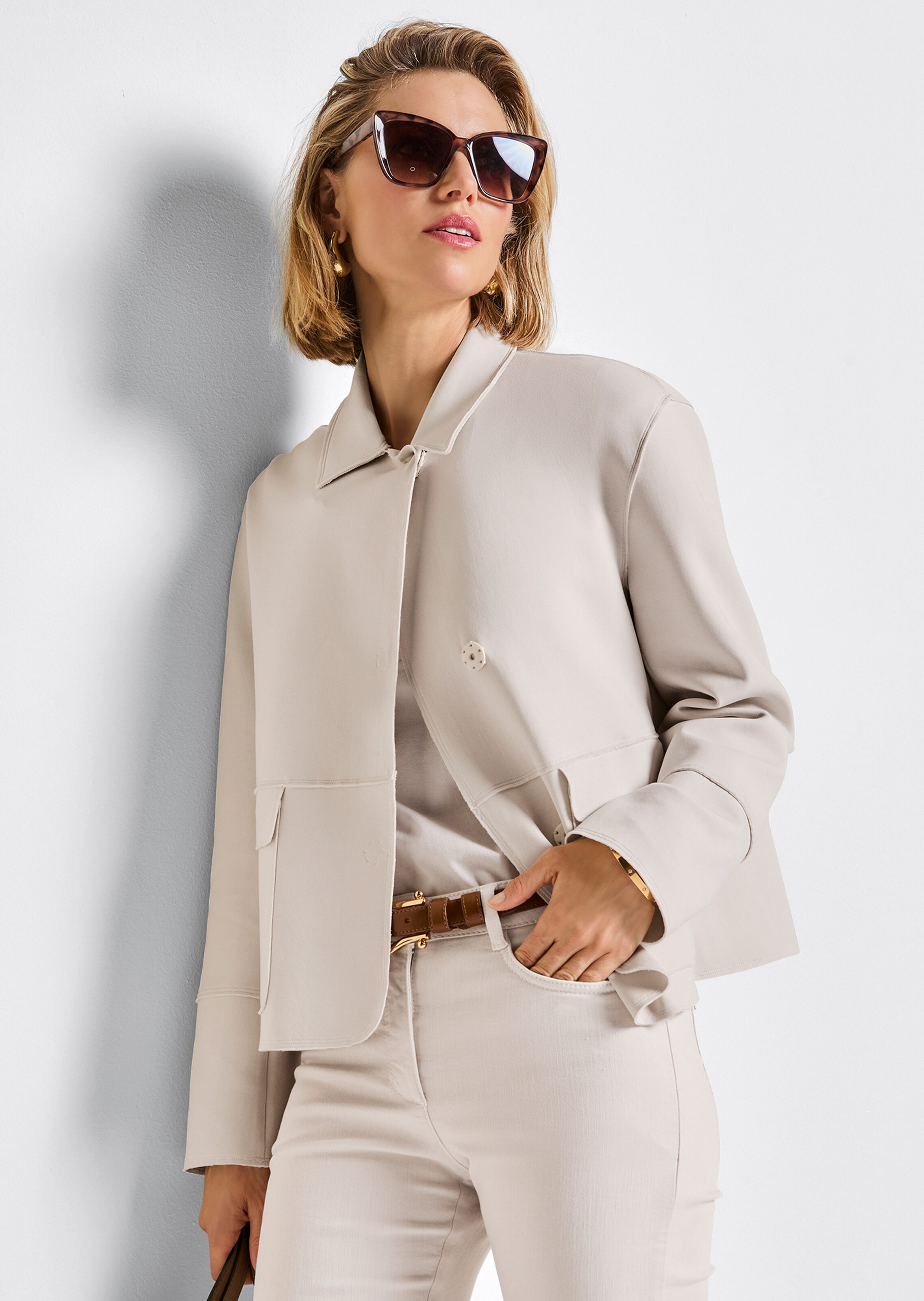 Offene Schnittkanten und die kurze, kastige Boxyform verleihen dem Blazer seine Modernität und jedem Look ein stylisches Finish. Die weiche Stretch-Qualität ist angenehm im Trage-Gefühl und macht jede Bewegung mit. Ein klassischer Hemdkragen, die einreihige Knopfleiste mit farblich passenden Knöpfen und aufgesetzte Taschen mit Patte runden das Lieblingsstück stilsicher ab.