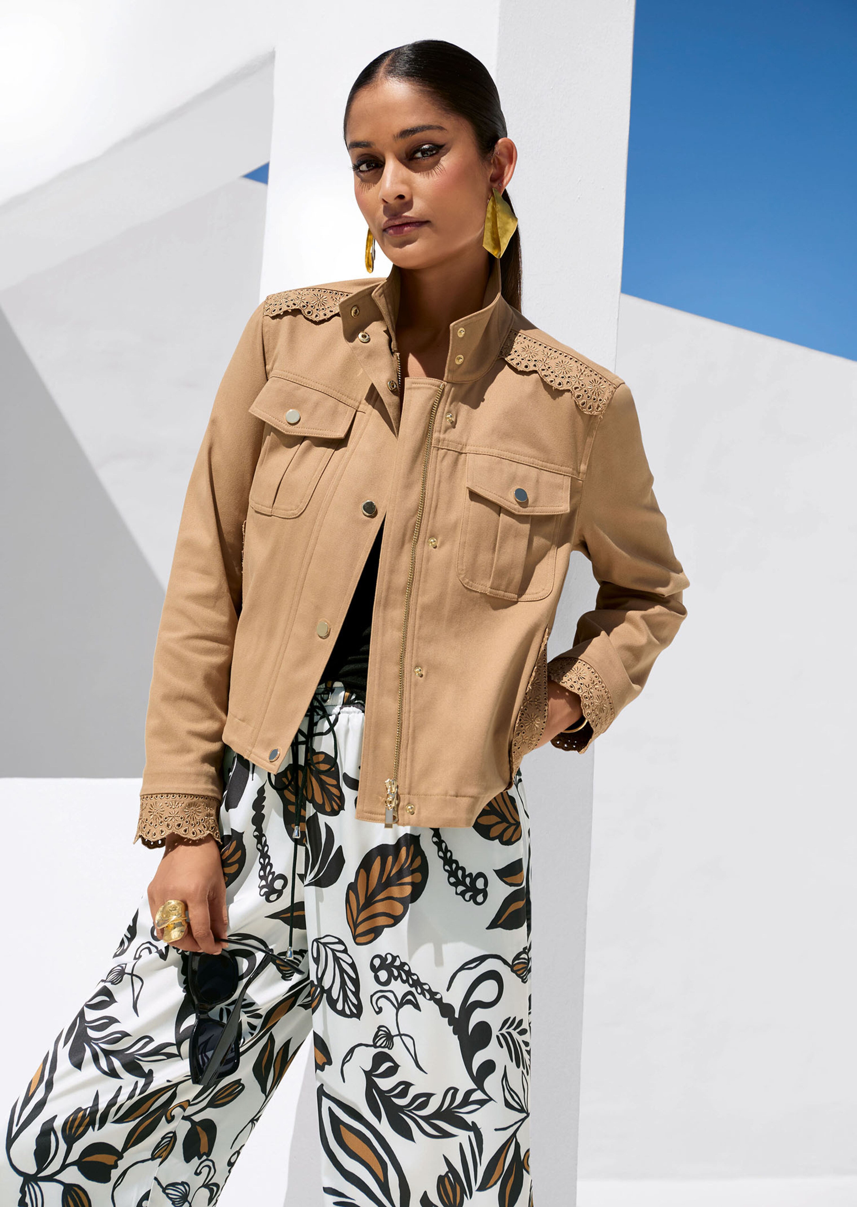 Mode Must-Have: Stilbruch! Lässigkeit und Romantik treffen bei dieser modern interpretierten Jacke stilvoll aufeinander. Eine edle, tonig abgestimmte Madeira-Spitze setzt an Schulter, Tascheneingriffen und Ärmelsaum wunderschöne Akzente. Ein Keypiece, das jede Kombination zu einem Highlight macht. In kastiger Kurzform zeigt sich das Modell mit Stehkragen, aufgesetzten Brustpattentaschen und verdecktem Zipper mit Druckerleiste. Die Jacke ist ungefüttert verarbeitet, denn pur auf der Haut ist sie ein frisches Trageerlebnis. Dafür sorgen vor allem die klimaaktiven Eigenschaften der Naturfaser Baumwolle. Der geringe Stretch-Anteil macht den Stoff elastisch und tragebequem.