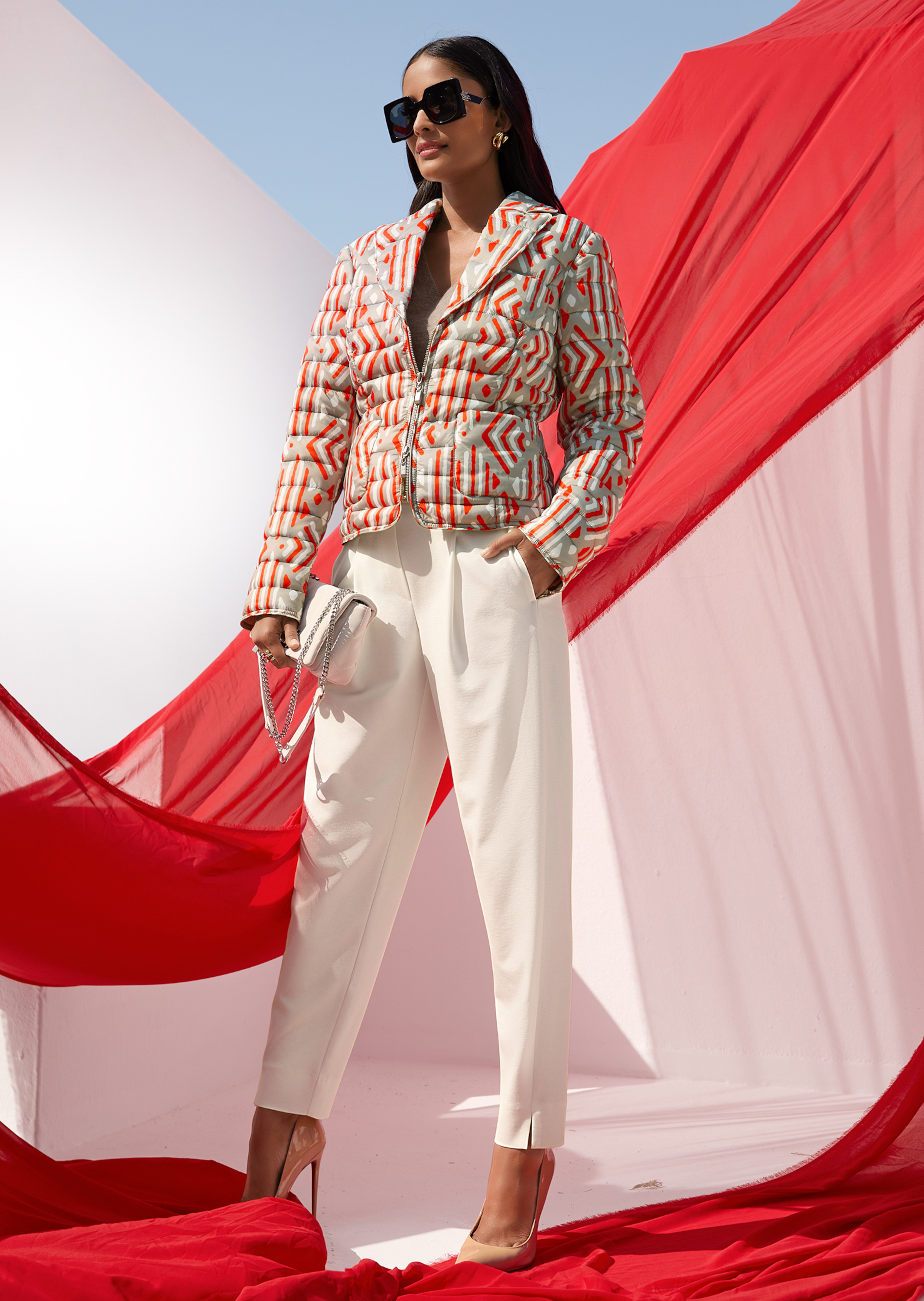 Leicht wattierter Sommer-Stepp - ideal für die etwas kühleren Tage und Abende des Sommers. Die modische Kurzform erinnert mit ihrem tiefen V-Ausschnitt und breitem Reverskragen an aktuelle Blazer-Varianten, bringt aber durch Ärmel-Reißverschlüsse und den vorderseitigen Zwei-Wege-Zipper sportiven Schwung in den Look. Der farbstarke Allover-Druck der Jacke bringt zusätzlich Modernität ins Spiel. Das fantasievolle Grafik-Muster ist von Modell zu Modell leicht unterschiedlich. Aufgesetzte Taschen im Taillen- und Brustbereich runden den Style perfekt ab.