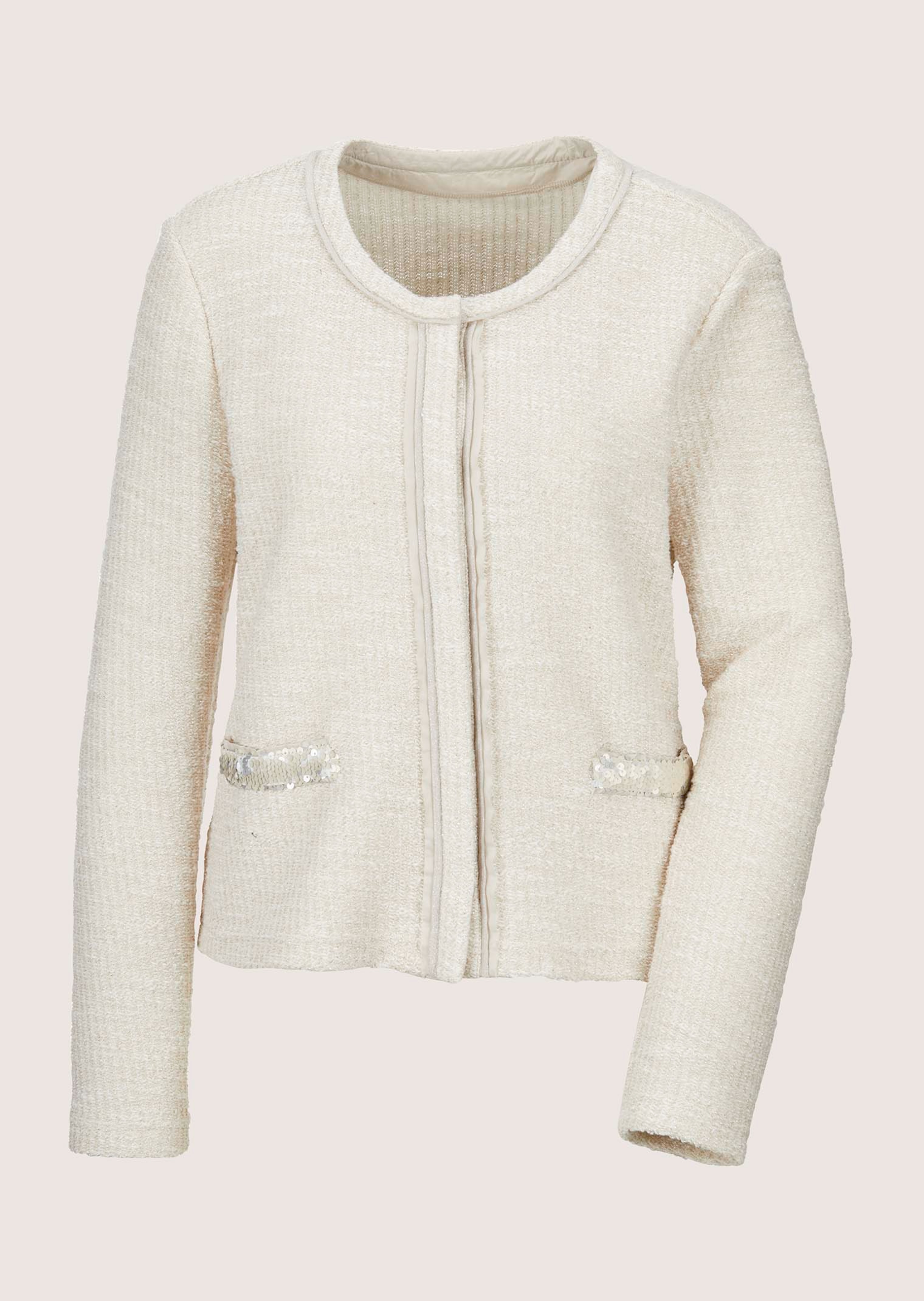 Sweat-Jacken werden neu inszeniert und bringen Pep in den Mode-Alltag! Couturige Kurzformen und Glitzer-Akzente verleihen dem Style ein trendstarkes Finish und machen es zum absoluten It-Piece! Die langärmelige Rundhals-Jacke zeigt sich hier in griffiger Struktur-Qualität und sorgt mit Pailletten-Details für glanzvolle Auftritte. Verdeckte Metalldrucker runden den Look ab.