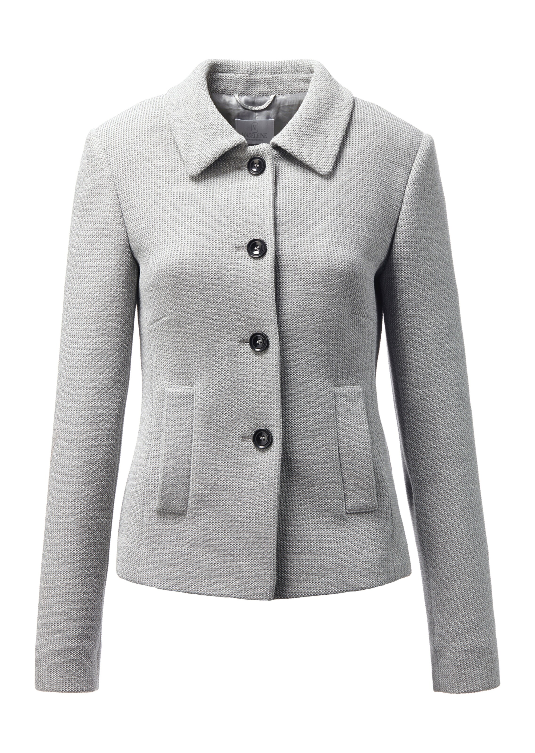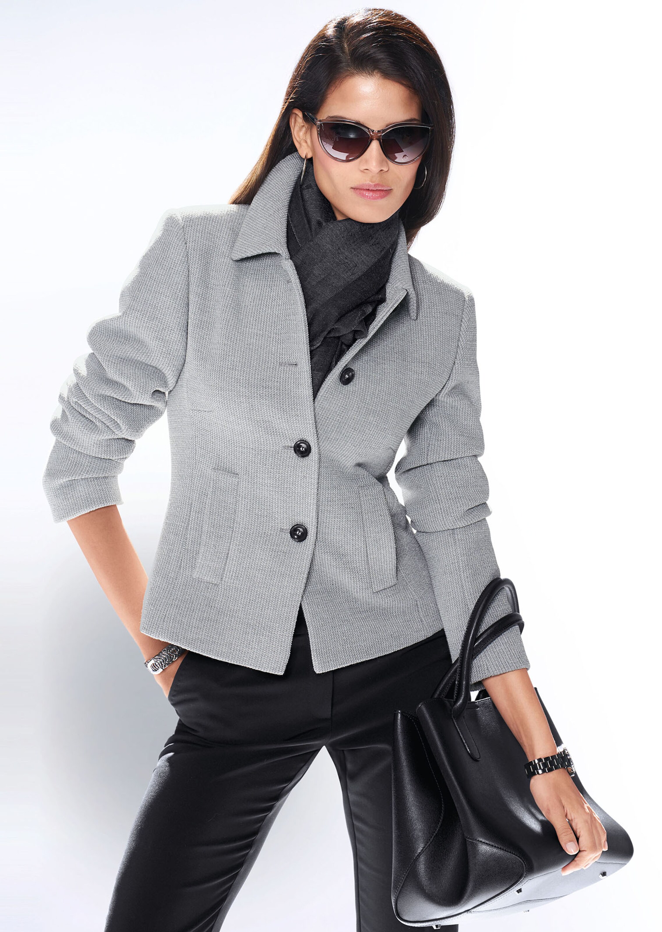 Ein kurzer Winterblazer, der sich in Ceramica-Qualität mit dekorativer Struktur zeigt. Die beliebte Ware überzeugt mit ihren Trage- und Pflegeeigenschaften. Dadurch ist sie zu einer Favoritin eleganter Modelle geworden. In edler Farbgebung können Sie den Blazer entweder zu schwarzen Partnern stylen oder auch einmal ganz lässig zu Denim. Als Allrounder der unterschiedlichsten Kombinationen begleitet Sie der Kurzblazer stilvoll durch den Winter. In dezenter A-Linie zeigt er sich mit Kragen, Längsleistentaschen und kontrastfarbenen Knöpfen. Kombinieren Sie ihn jetzt auch mit einem Tuch für einen modernen, lässigen Look.