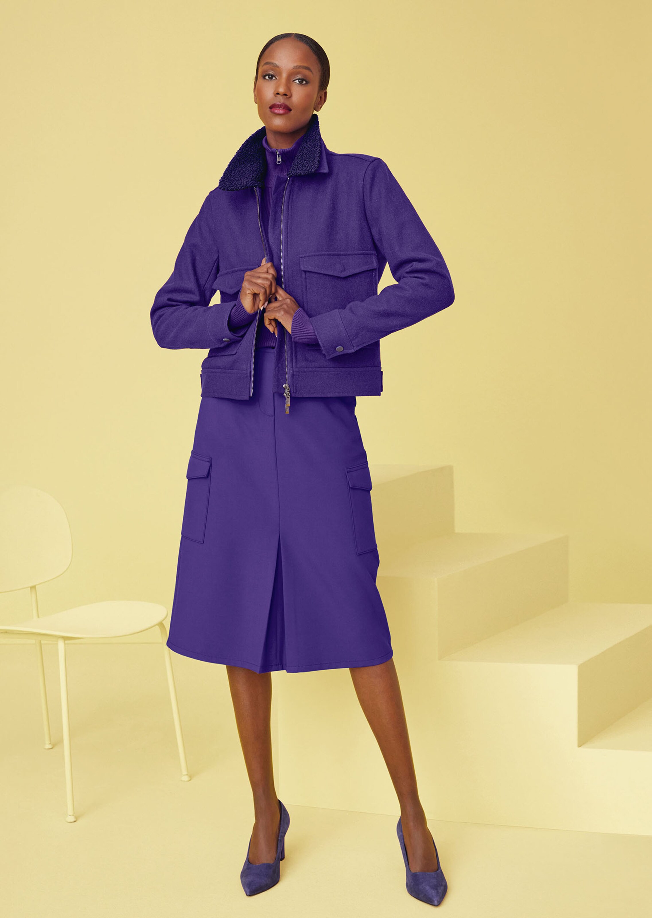 Die neuen Trendjacken punkten mit Komfort und modischer Vielfalt. Die Wollmischung der Kurzjacke unterstreicht in leicht kastiger Form ihre Modernität und ist auf einen 2-Wege-Zipper zu schließen. Der Webpelzkragen wirkt besonders »cosy« und kann bei Belieben abgenommen werden. Aufgesetzte Pattentaschen, lange Manschettenärmel und ein Drucker-Riegel am Saum runden den Look ab.